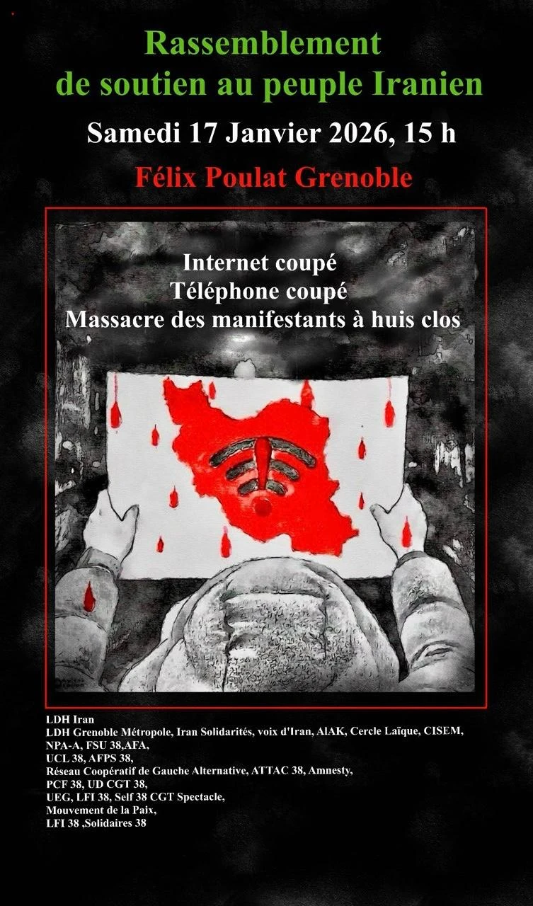 Appel au rassemblement de soutien au peuple iranien samedi 17 janvier 2026 à 15h place Félix Poulat à Grenoble Le thème principal est une image ensanglantée de l'Iran Texte: Internet coupé, Téléphone coupé, Massacre des manifestants à huis clos # Signataires - AFA - AFPS 38 - Amnesty - ATTAC 38 - Cercle Laïque - CISEM - FSU 38 - Iran Solidarités - LDH Grenoble Métropole - LDH Iran - LFI 38 - Mouvement de la Paix - NPA-A - PCF 38 - Réseau Coopératif de Gauche Alternative - Self 38 CGT Spectacle - Solidaires 38 - UD CGT 38 - UEG - UCL 38 - Voix d'Iran