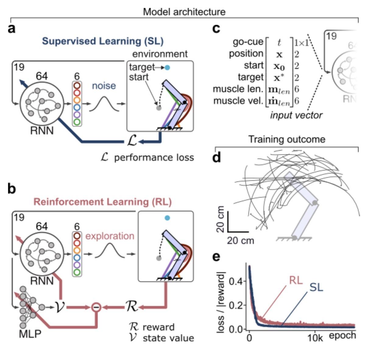 🧠 New preprint by Codol et al. (2025): Brain-like #NeuralDynamics for #behavioral control develop through #ReinforcementLearning. They show that only #RL, not #SupervisedLearning, yields neural activity geometries & dynamics matching monkey #MotorCortex recordings. RL-trained #RNNs operate at the edge of #chaos, reproduce adaptive reorganization under #visuomotor rotation, and require realistic limb #biomechanics to achieve brain-like control.