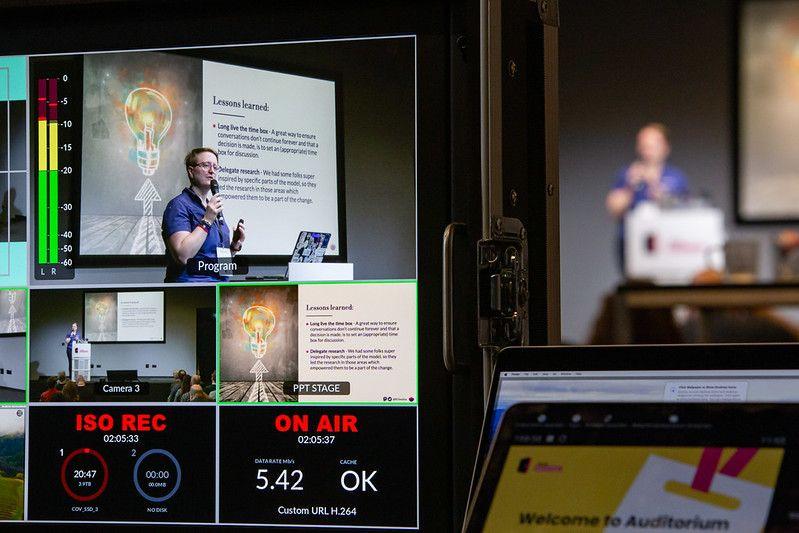 Anna e só, a young white femme person in their early 30s, holds the microphone in front of the stage near a stand with their laptop full of stickers as they talk about Outreachy. They have very short hair they're wearing prescription glasses with black frames with a grey, valved N95 mask. They're wearing a black shirt with a beautiful illustration of big Mandacaru flowers in their chest layered with a black turtleneck and a black long skirt. The pink lanyard of the conference creates a nice contrast against their clothes. In the foreground, but blurred, Jarek (the moderator of the stage—an older white man in a black t-shirt) watches Anna speak.