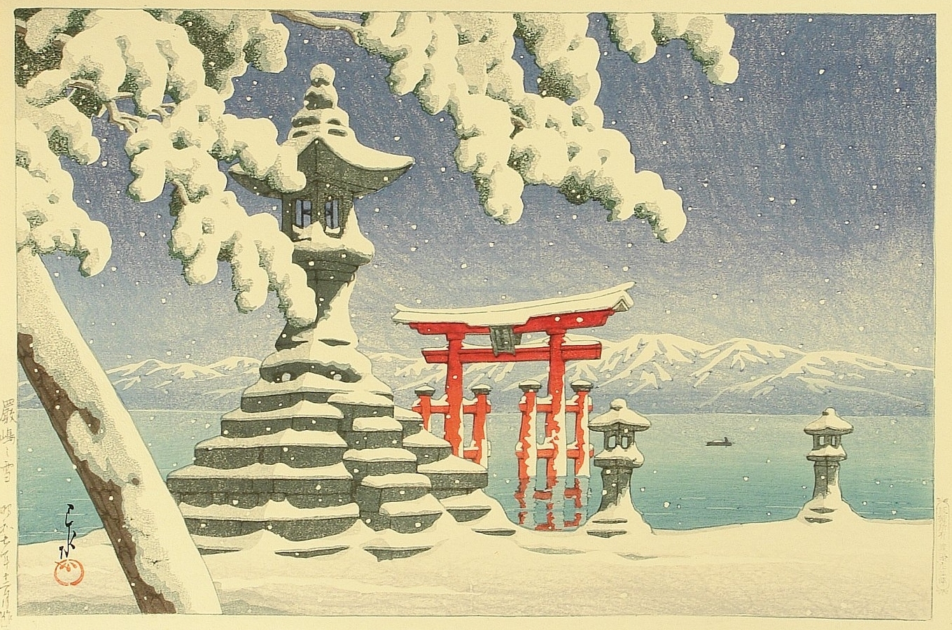 'Snow at Miyajima' - Kawase Hasui, 1932. #ToriiTuesday #JapaneseArt