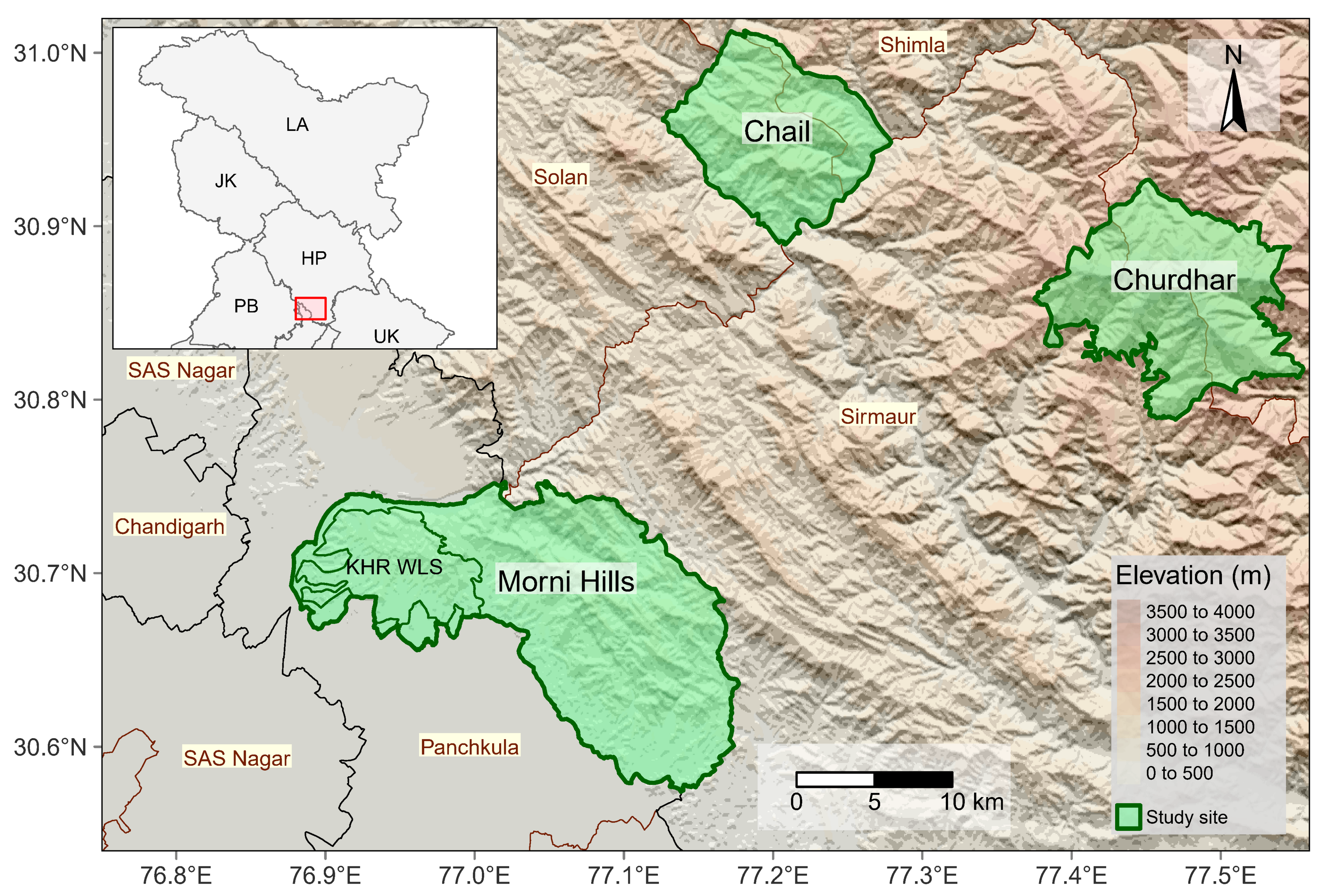 Map showing the locations of three study sites—Morni Hills, Chail Wildlife Sanctuary, and Churdhar Wildlife Sanctuary—across the northwestern Himalayas. The main map depicts topography with shaded elevation ranging from 0 to 4000 meters, where darker shades represent higher elevations. The study sites are outlined in green, with Morni Hills located in Haryana, and Chail and Churdhar in Himachal Pradesh. Surrounding districts, including Panchkula, Sirmaur, Solan, Shimla, and SAS Nagar, are labeled. An inset map in the upper left corner shows the broader regional context within northern India, highlighting the states and union territories of Punjab (PB), Haryana (HR), Himachal Pradesh (HP), Uttarakhand (UK), Jammu and Kashmir (JK), and Ladakh (LA), with a red box indicating the study area’s location. A north arrow and scale bar (0–10 km) are included for orientation.