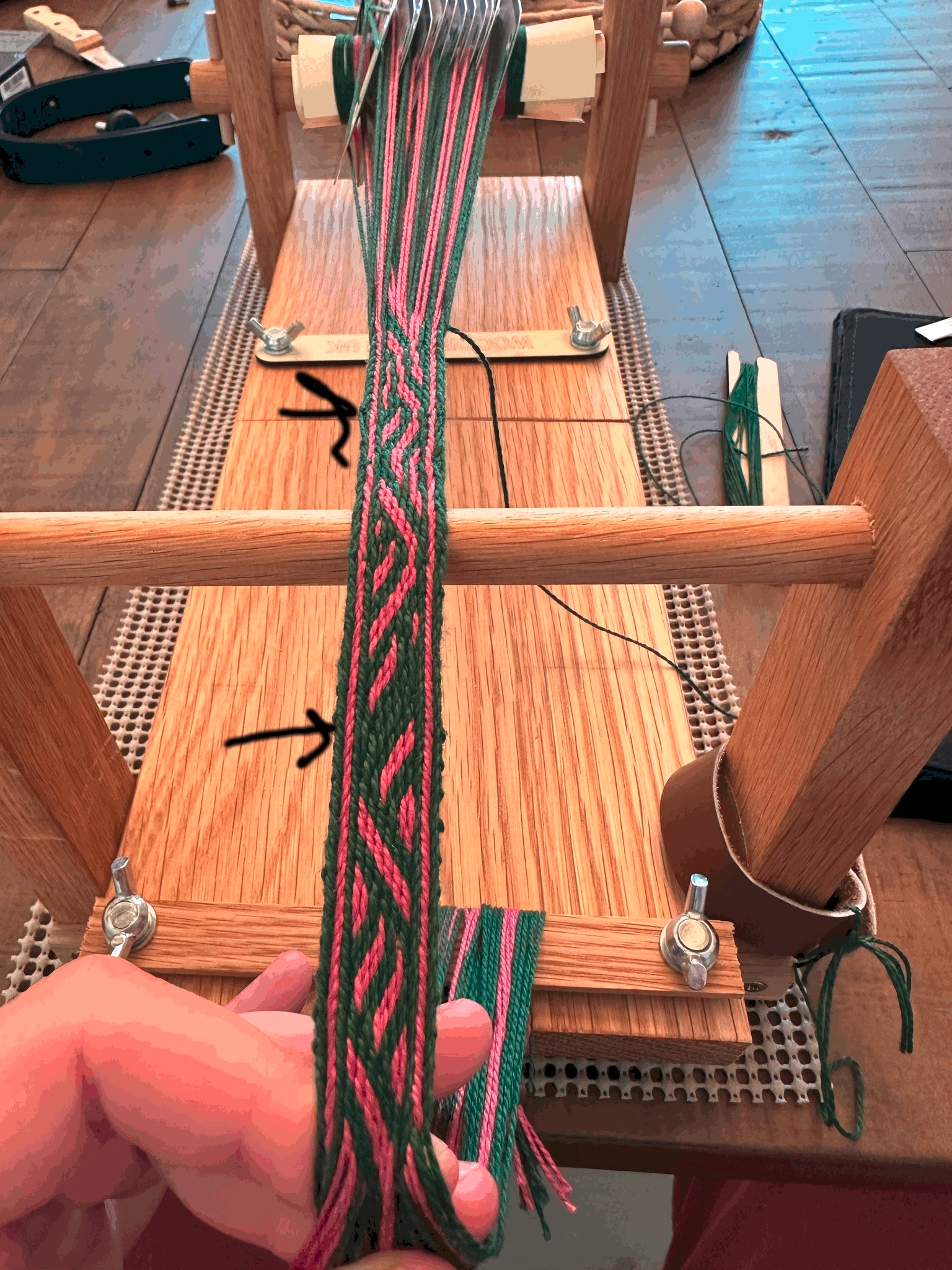 I've maybe discovered a #TabletWeaving pattern that can't be woven on my portable loom. Woven forward, it looks great! (See arrow at the bottom marking the end of the first correct forward pattern.) But several of the cards build up twist, and "everyone" says to just weave backwards or flip the cards. But regardless of whether I go backwards or flip, I get these funny little squiggles at the end of the pattern (see top arrow pointing at them).