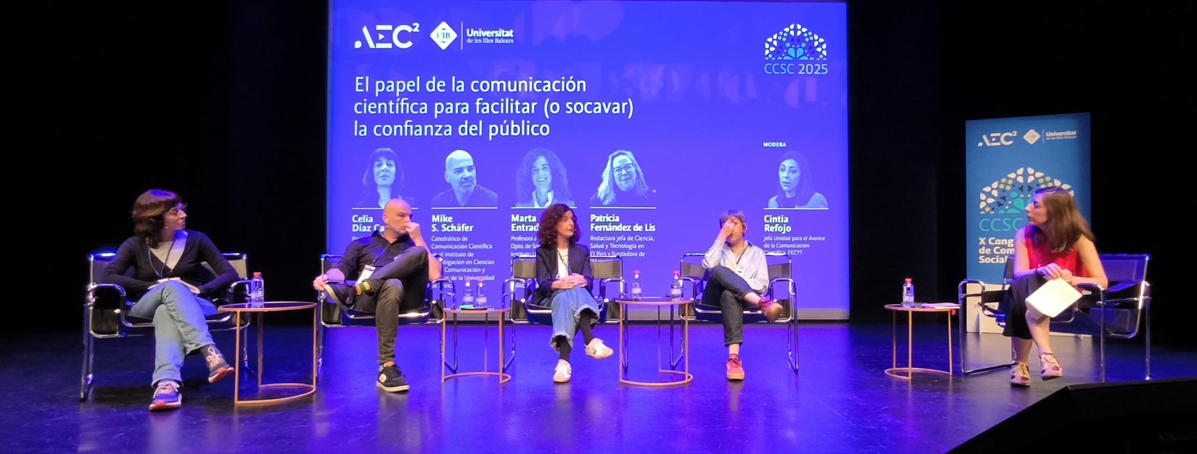 La última mesa redonda, que no es redonda ni tiene mesa, en #ccsc2025 trata del papel de la comunicación científica para facilitar (o socavar) la confianza del público. Interesantísimo análisis que modera Cintia Refojo (FECYT): con Celia Díaz Catalán (UCM/FECYT), Mike S. Schäfer (UZH), Marta Entradas (ISCTE‑IUL/LSE) y Pampa Garcia Molina (SMC).