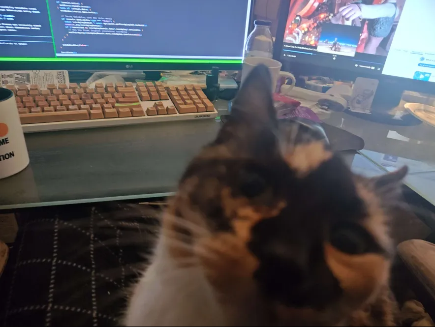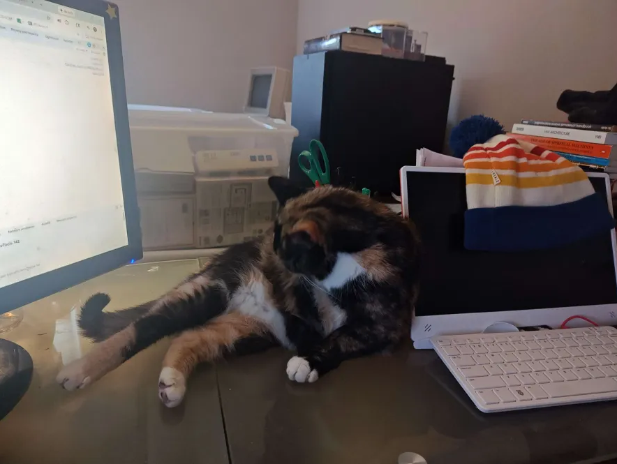 Our foster cat ("Little Girl") is all vaccinated up and they are stuck in my office (don't judge my messy desk and I'm wearing PJs sue me