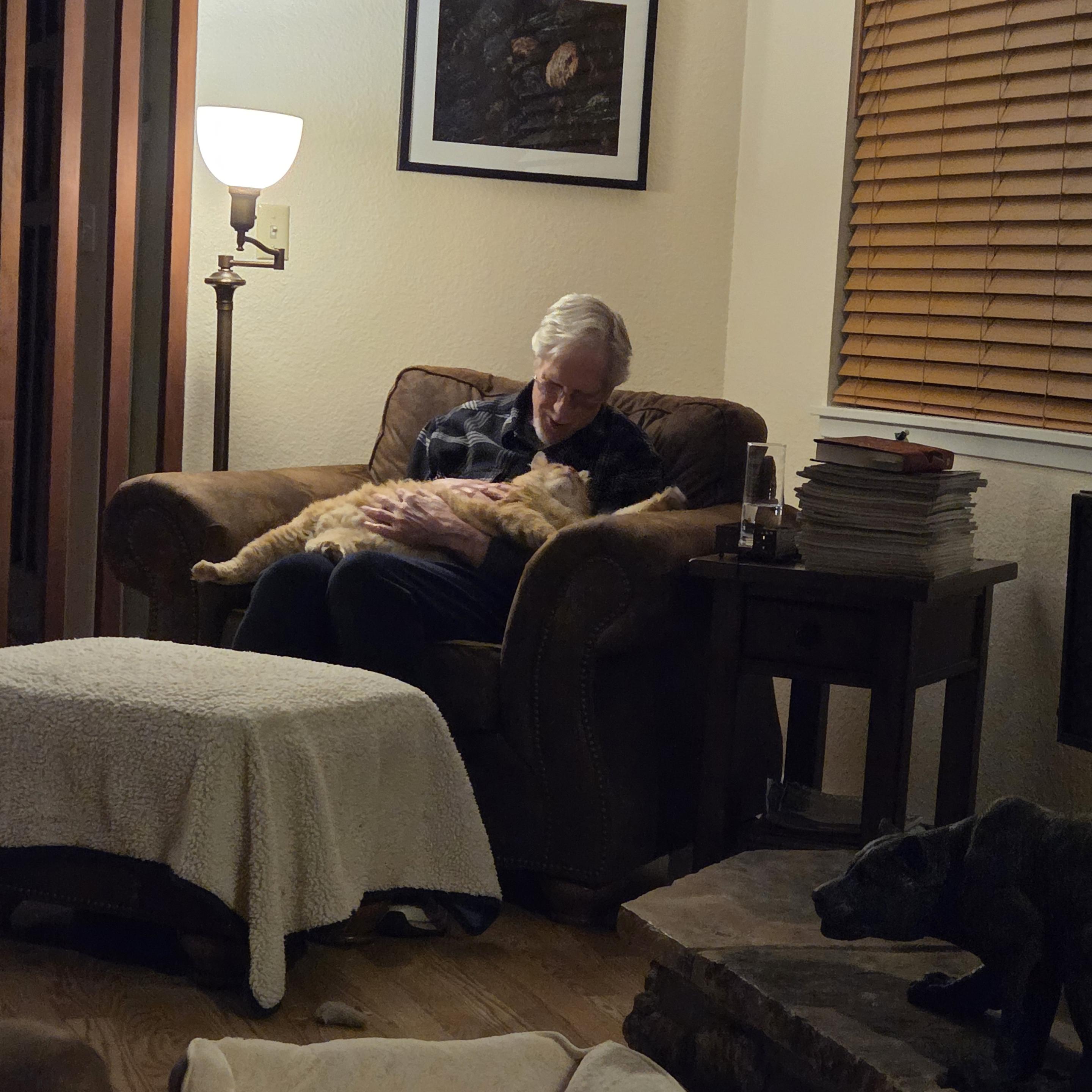 To our further delight, he’s something of a lap cat. He often gets onto the sofa to snuggle up next to Randy, then crossing over Randy’s lap to share the snuggling with me, and one memorable night he got into Randy’s lap in the armchair.