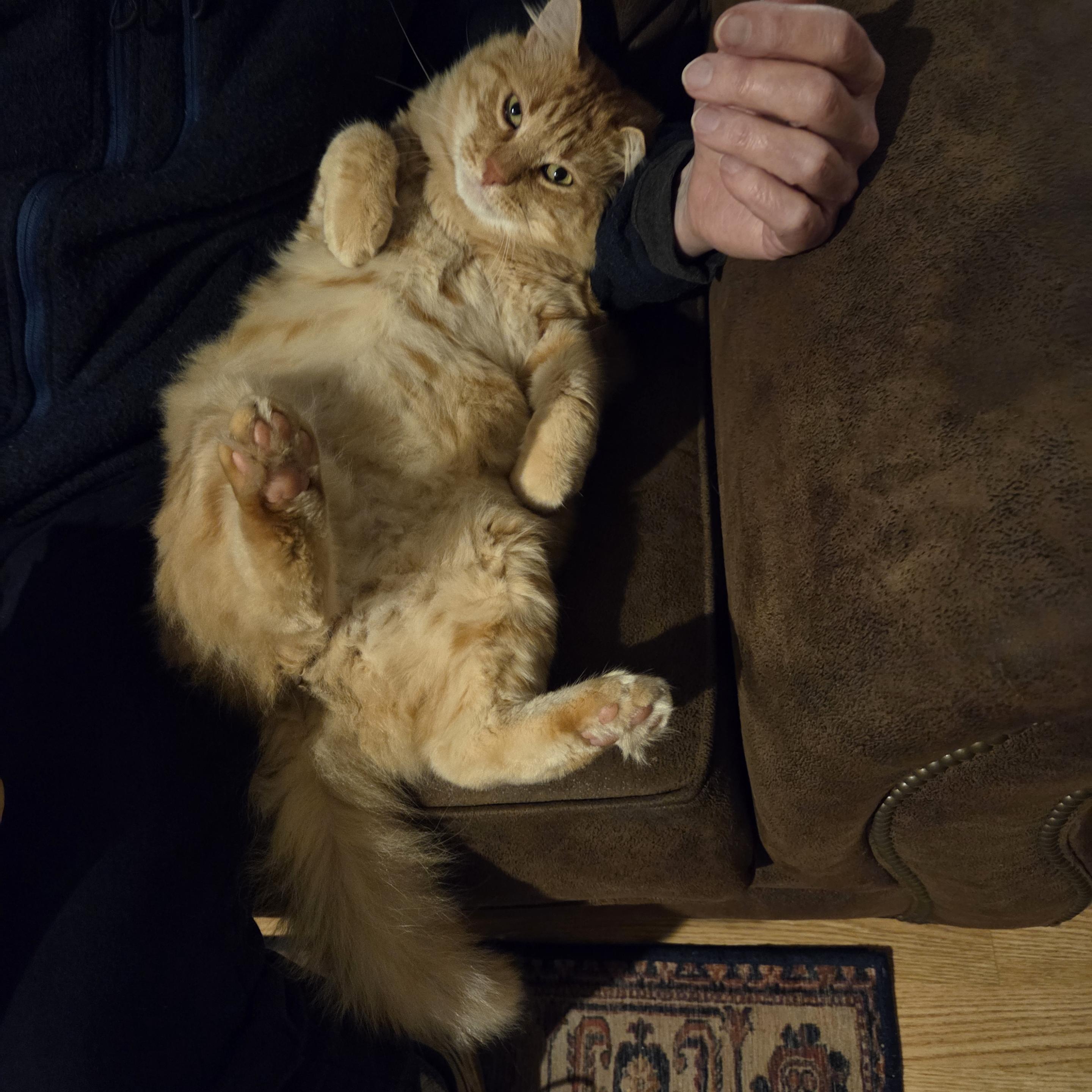 The big surprise in our lives has been the transformation of Obie. It was February of 2024 when a hungry orange tabby showed up with a scarred face and ragged ear. When we began feeding him, he behaved like a feral and was untouchable.