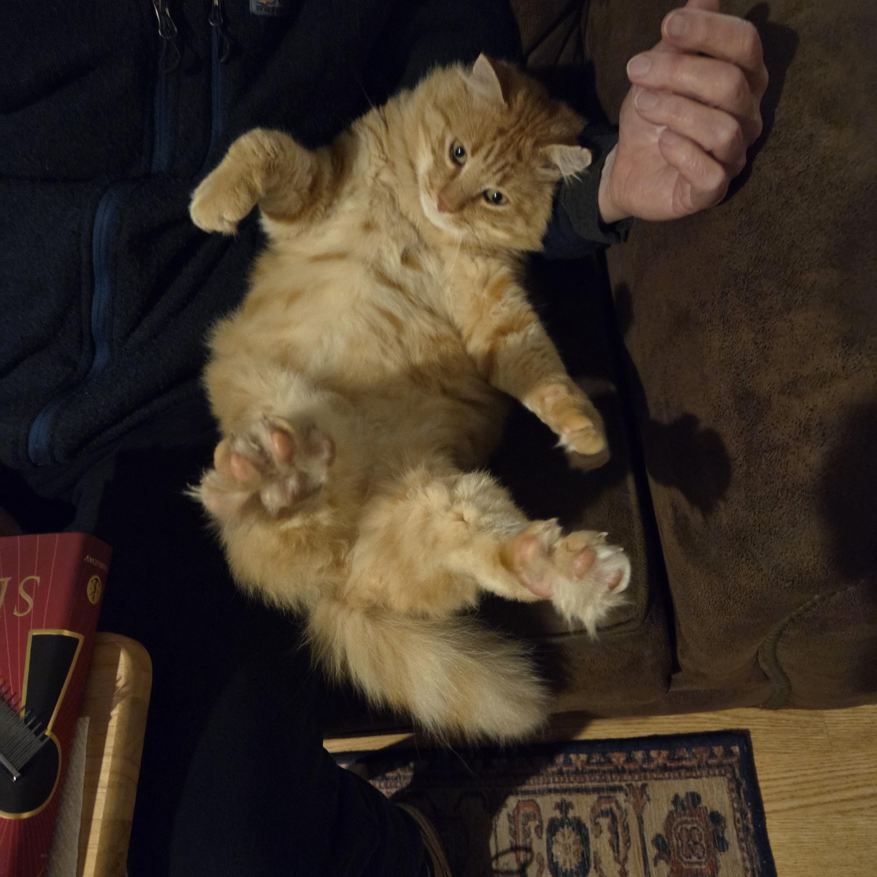 Now that we’ve won his trust, he turned out to be a wonderful, affectionate, sweet cat. I’ve never seen a cat that likes to spend so much time with his belly up. He lets us scratch him under the chin, and rub his chest and belly.