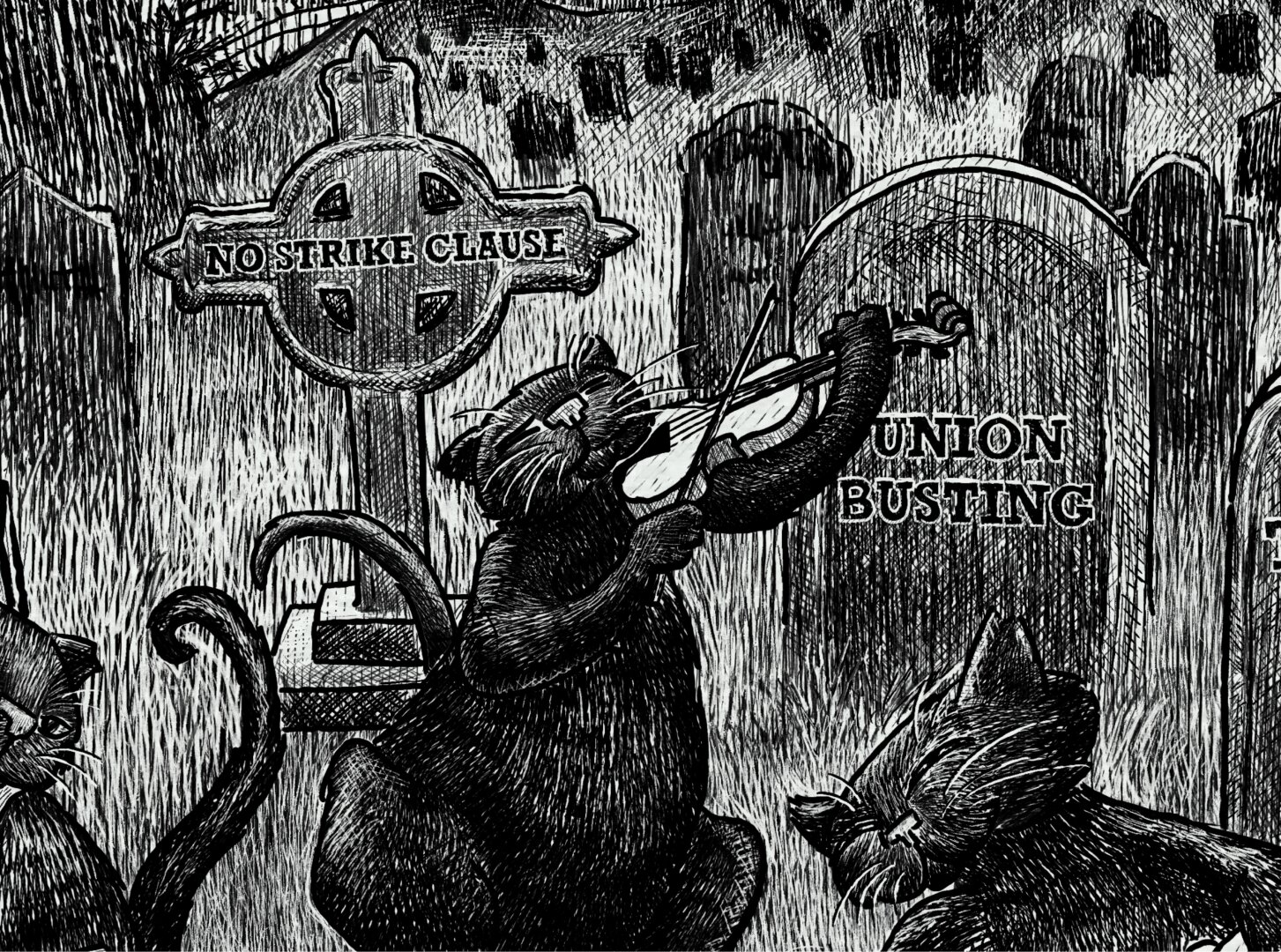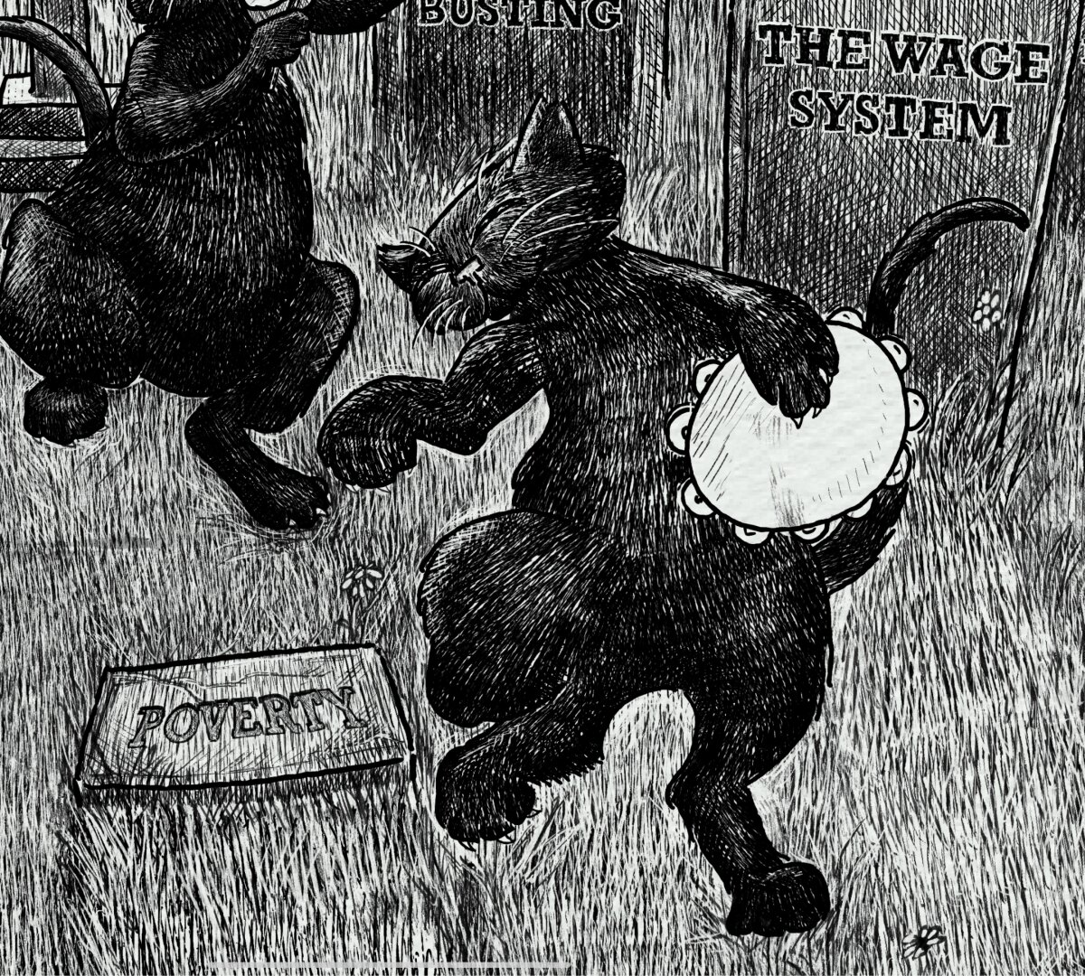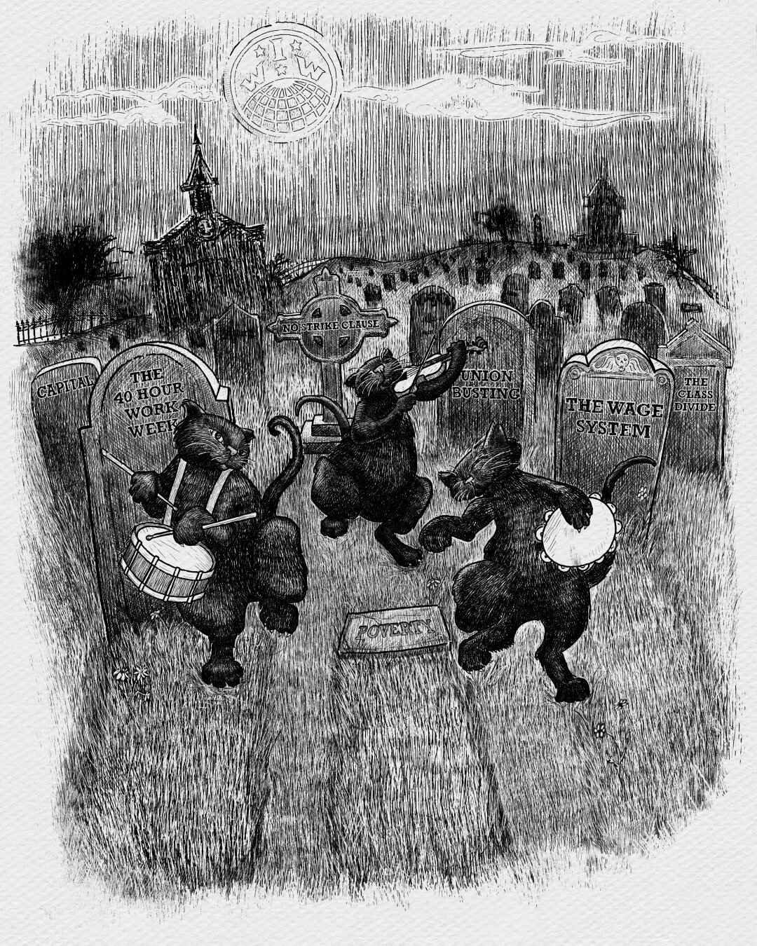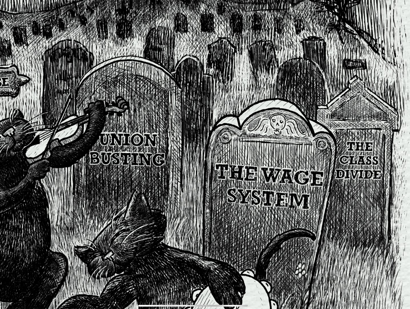 It’s done! It’s my annual Hallo’iww’een illustration for our local Bay Area branch of #IndustrialWorkersoftheWorld Good riddance to the wage system and all the other ghouls! #iww #onebigunion #generalstrike #halloween #sabocat #blackcat #union #cat #graveyards