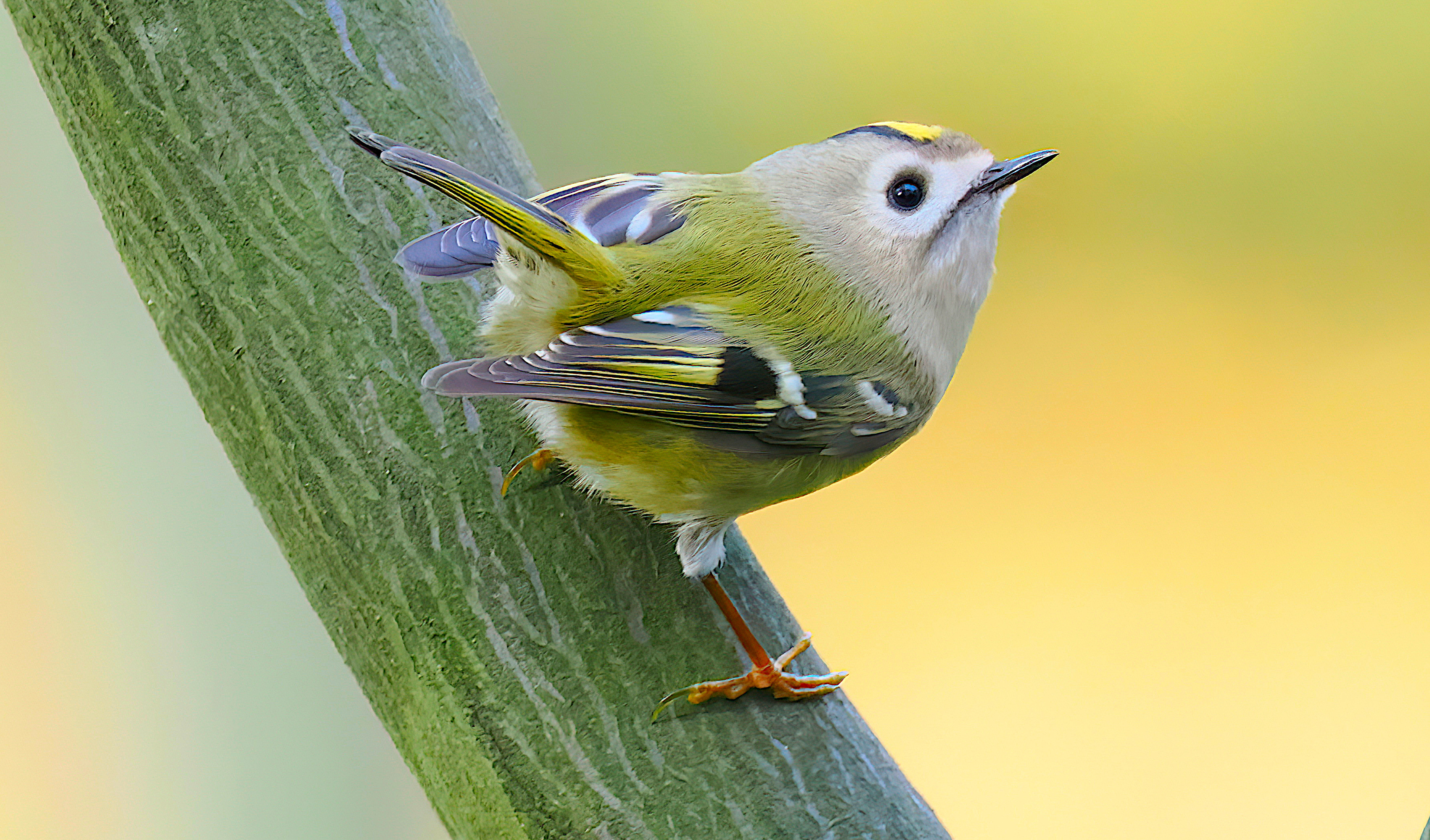 Wintergoldhähnchen klammert sich an einen schmalen Zweig.