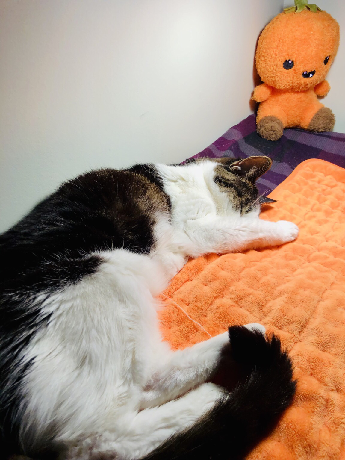 Pic credit: my 17 year old rescue cat napping on a heatpad, behind u see a pumpkin plushie. The heat lamp above her is for my lizard (not pictured, he napping on my chest RN) 馃敟