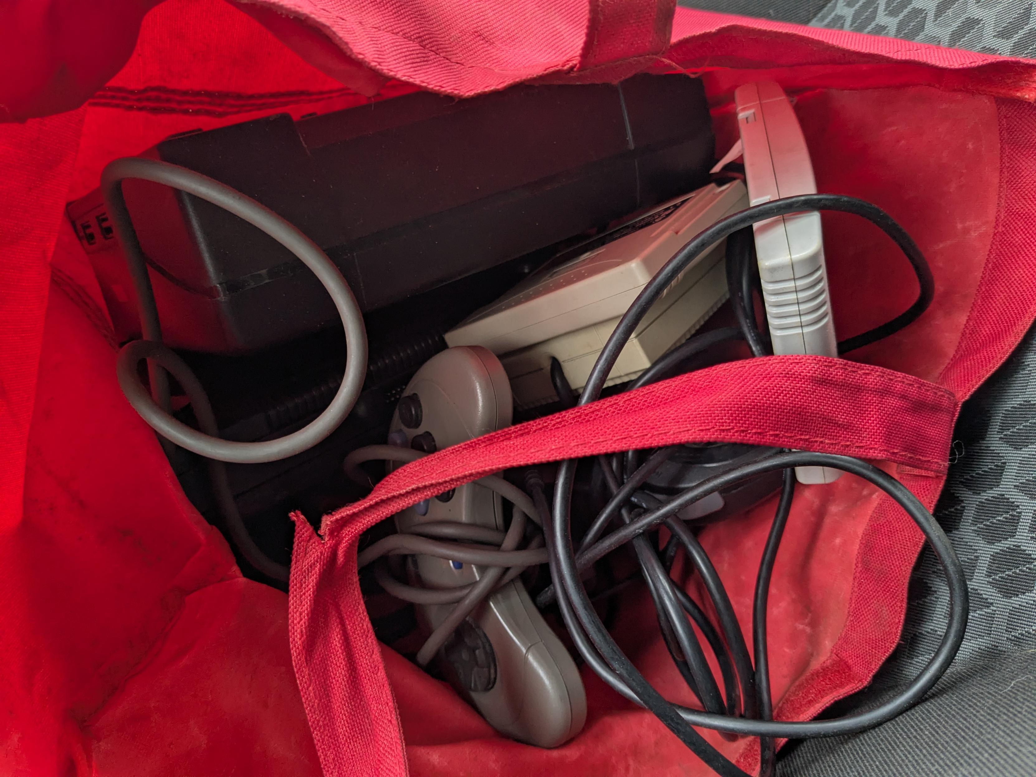 Photo of the innards of a red bag. Several consoles and accessories can be seen inside, in a jumble of wires.