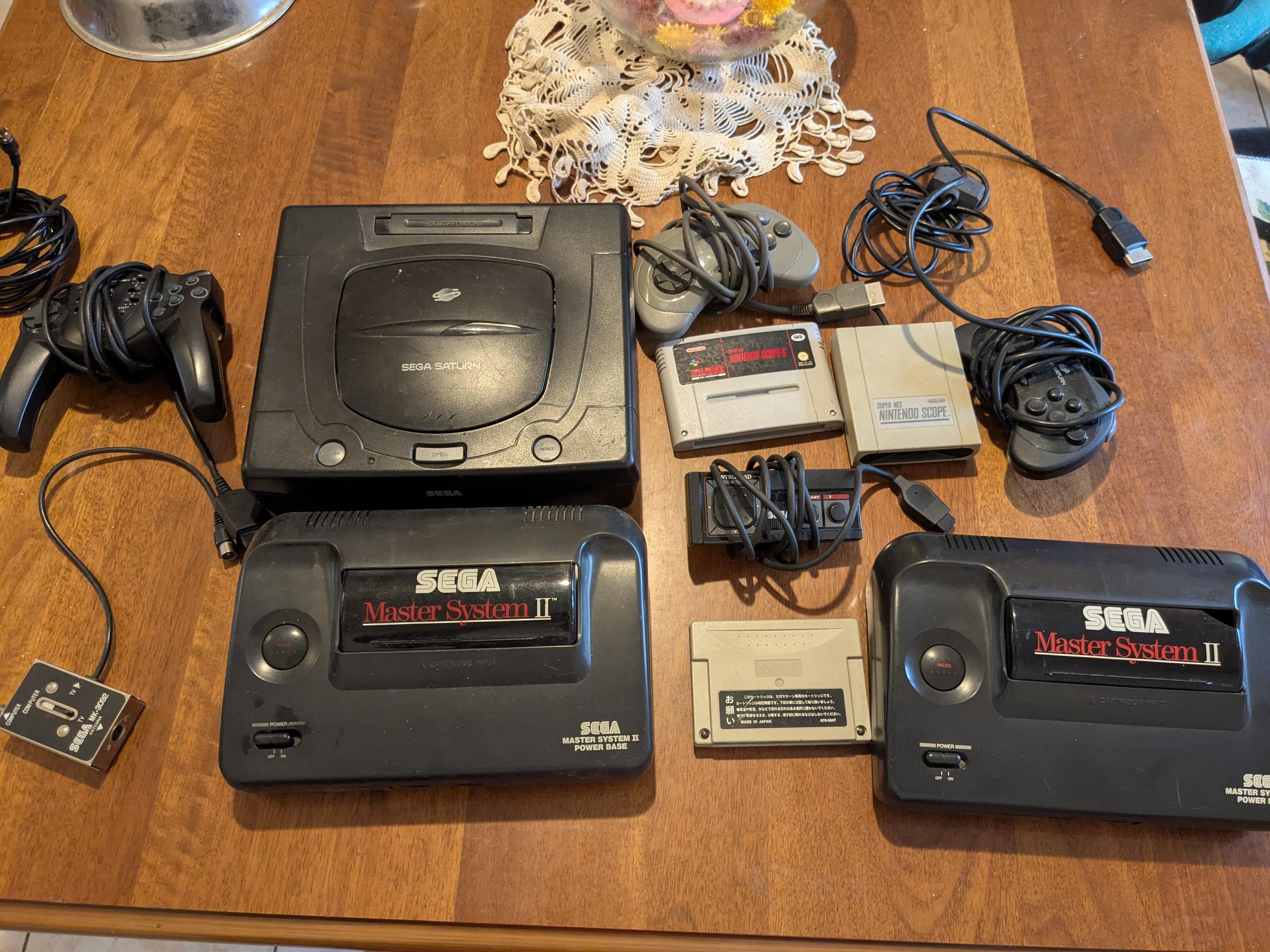 Photo of several consoles on a wooden table. A Saturn, and two master systems can be seen, plus some pads and Nintendo accessories.