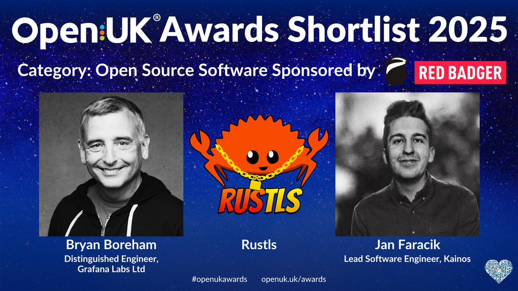 OpenUK Awards 25 Open Source Software Category sponsored by Red Badger, Shortlist is live, congratulations to the shortlisted nominees: @bboreham, Rustls https://github.com/rustls/rustls ( @ctz), and Jan Faracik 🍾🥂🏆