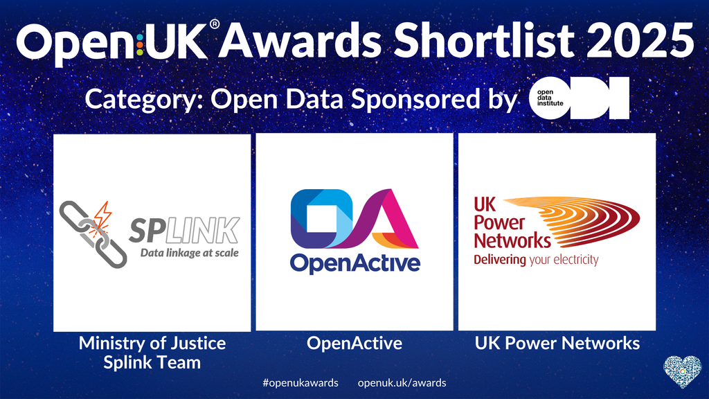 OpenUK Awards 25 Open Data Category sponsored by Open Data Institute, Shortlist is live, congratulations to the shortlisted nominees: Ministry of Justice UK Splink Team (Robin Linacre), OpenActive, and UK Power Networks (Yiu-Shing Pang) 🍾🥂🏆