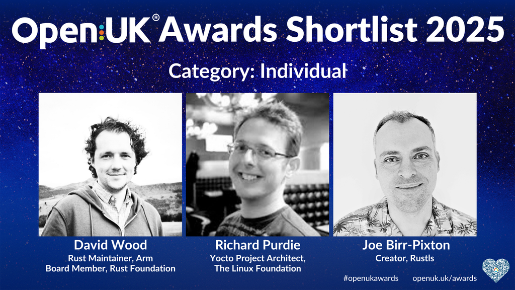 OpenUK Awards 25 Individual Category Shortlist is live, congratulations to the shortlisted nominees: @davidtwco, Richard Purdie, and @ctz 🍾🥂🏆