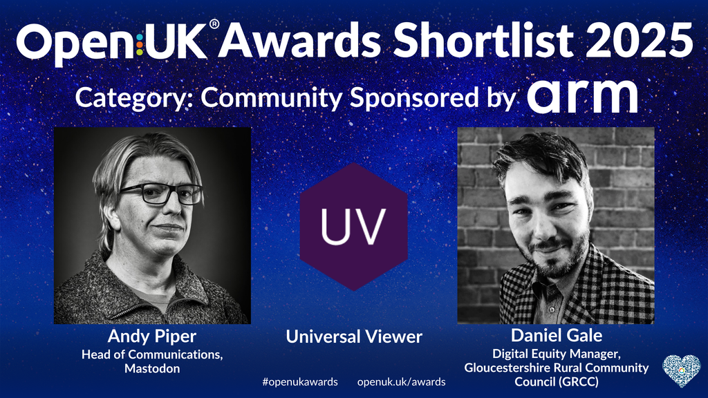 OpenUK Awards 25 Community Category sponsored by Arm, Shortlist is live, congratulations to the shortlisted nominees: @andypiper, @universalviewer (https://universalviewer.io/), and Daniel Gale 🍾🥂🏆