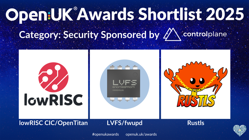 OpenUK Awards 25 Security Category sponsored by ControlPlane, Shortlist is live, congratulations to the shortlisted nominees: lowRISC CIC, Linux Vendor Firmware Service (https://fwupd.org/) @hughsie, and Rustls (https://github.com/rustls/rustls) 🍾🥂🏆