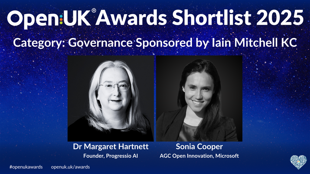 OpenUK Awards 25 Governance Category sponsored by Iain G. Mitchell KC Shortlist is live, congratulations to the shortlisted nominees: Dr Margaret Hartnett, and Sonia Cooper 🍾🥂🏆