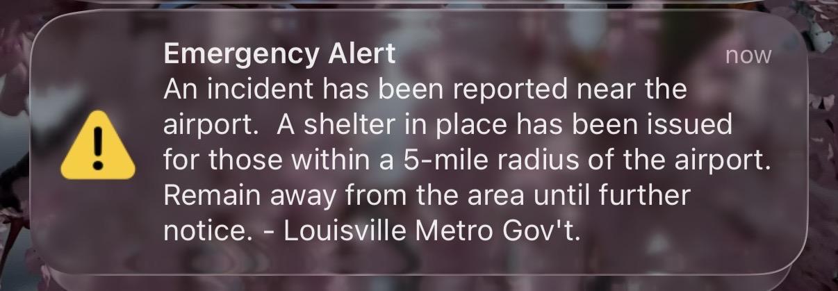 "Jefferson County: Shelter in place update: The shelter in place has been further revised. The new shelter in place is now from Outer Loop northbound to the Ohio River. Continue to shelter in place and avoid contact with smoke from the incident near the Airport. Area's south of Outer Loop are now cleared from the shelter in place. Source: Louisville Metro Emergency Services " 11/05/25 0017UTC #UPS2976 #SDF #planecrash #aviation