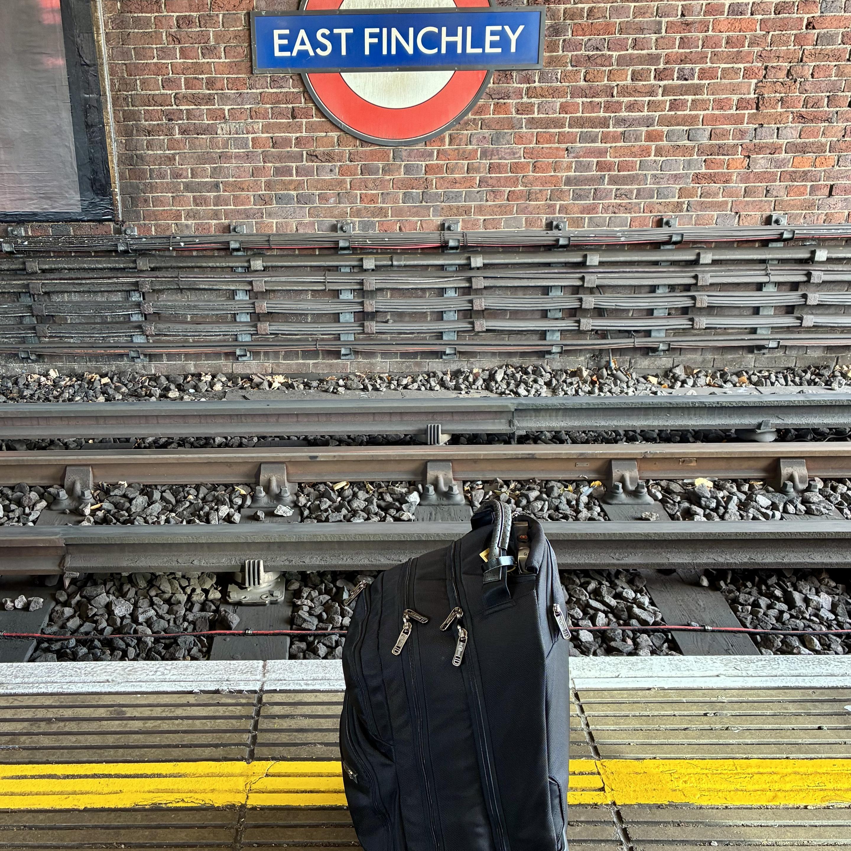 A black suitcase is placed on a train platform at East Finchley station. A red and white roundel sign with the station name is visible in the background, alongside brick walls and railway tracks.