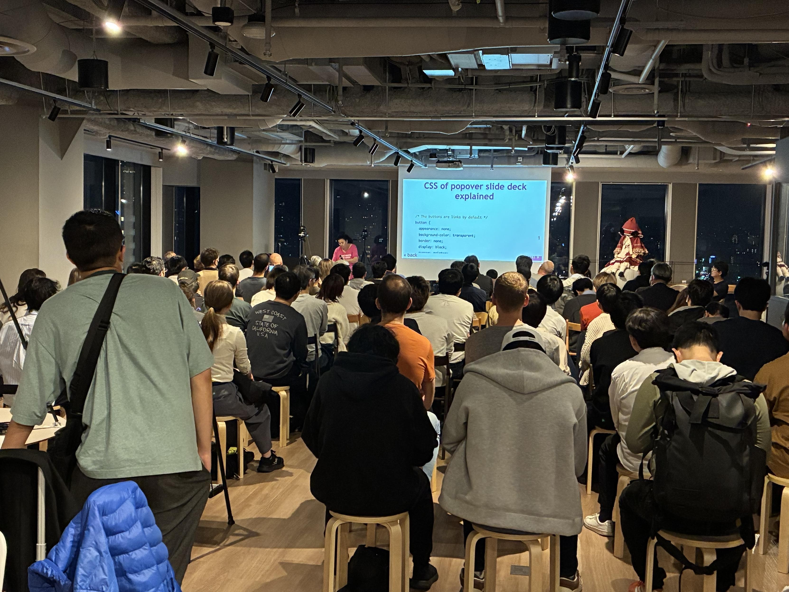 A crowd of people sits in an indoor space, attentively watching a presentation. The presenter, standing on a stage, is visible on the right, while a slide displayed on a screen outlines topics related to CSS and popover slide decks.