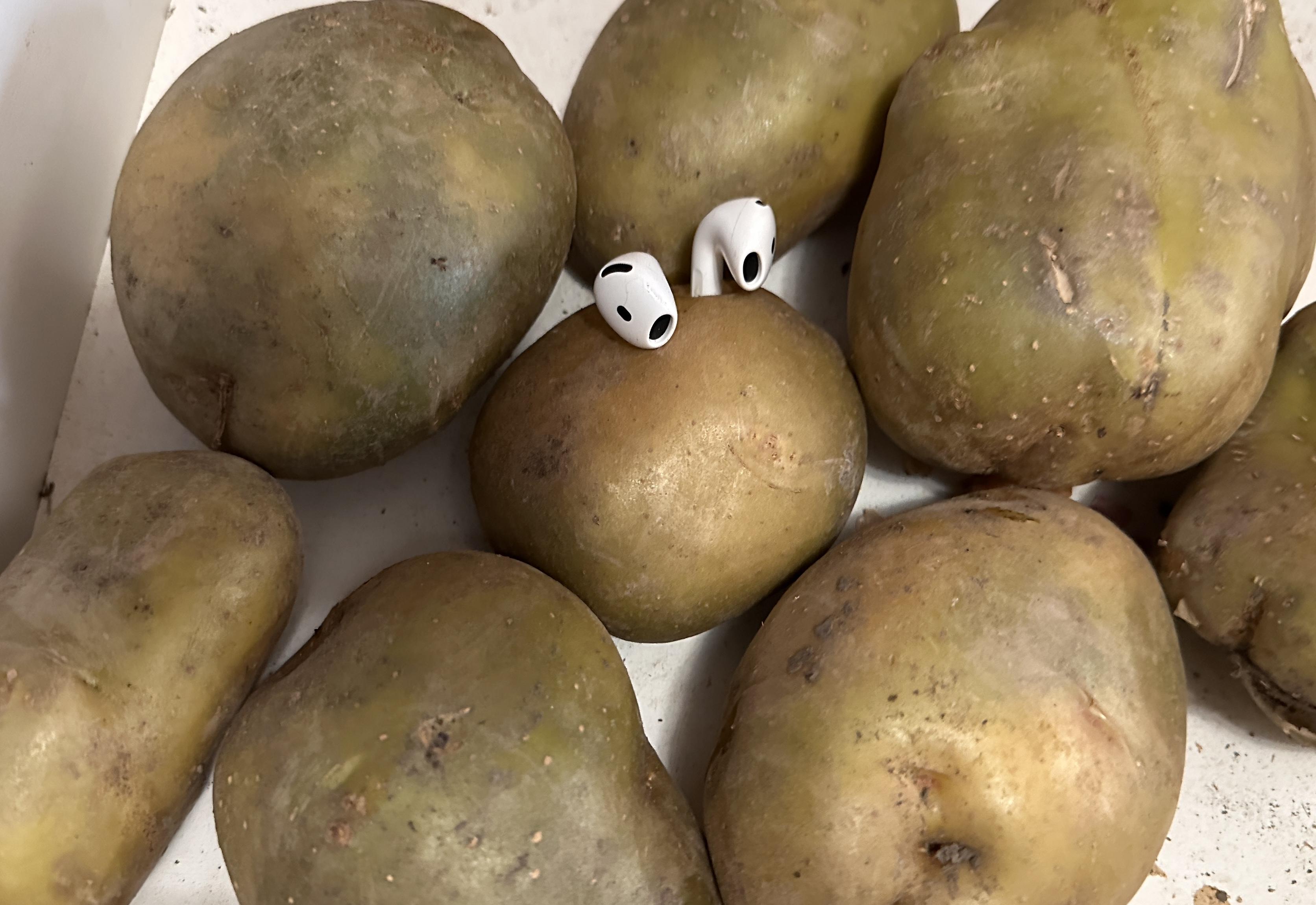 Insider a kitchen drawer, a ring of 7 potatoes. The center one has protruding from it a pair of Apple Ear bud headphones, so it can hear me at all times!
