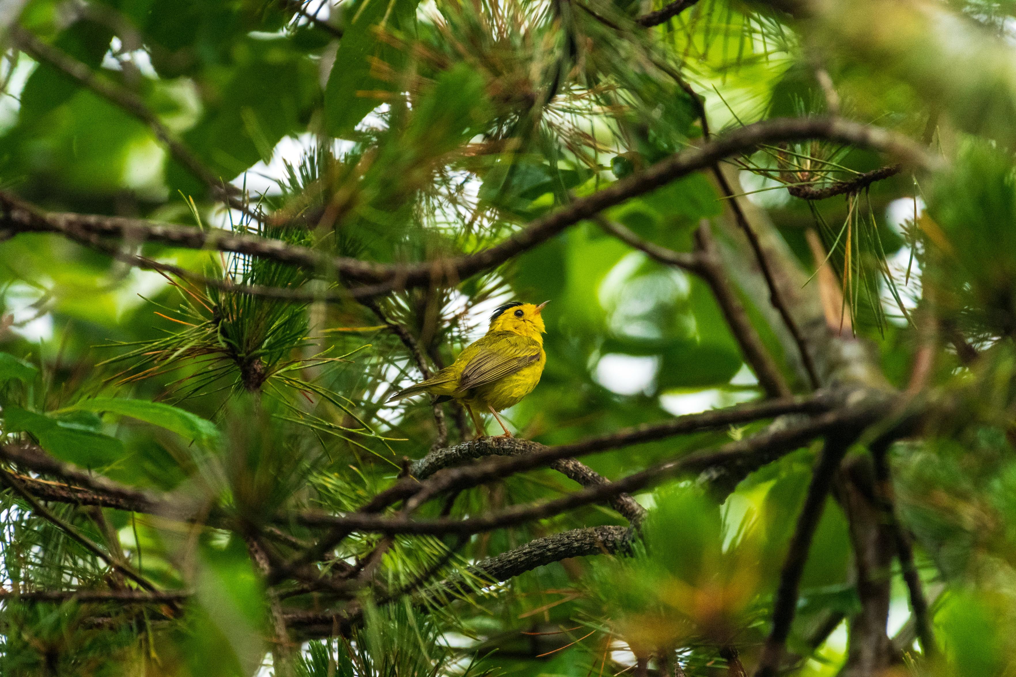 A wet Wilson’s warbler perched on a branch of a pine tree, looking around. Its black cap looks particularly slick.
