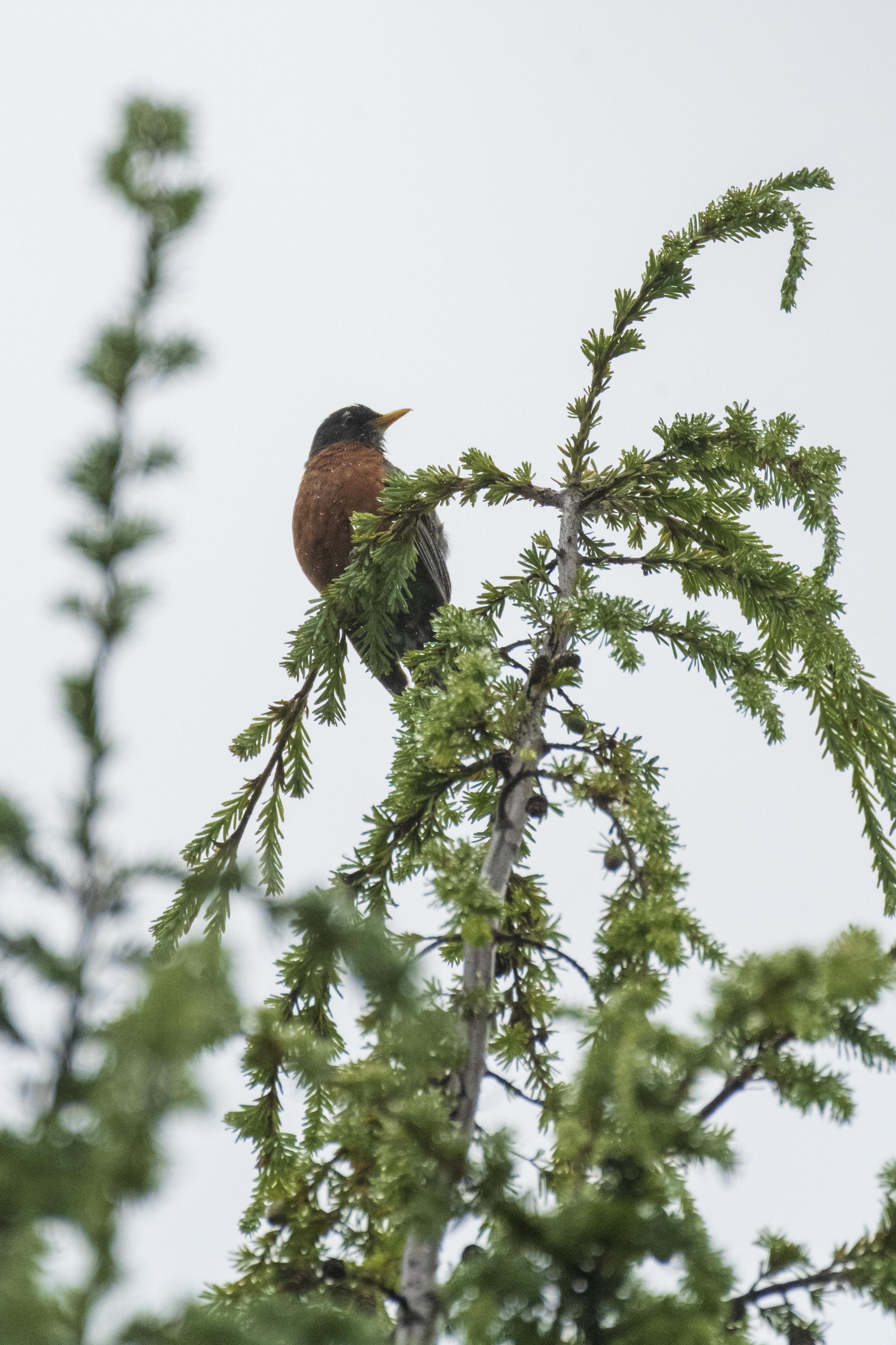 An American robin perched on the top of a pine tree. It looks to be handling the wetness very well, as it doesn’t look particularly drenched, even though you can see small rain drops in the picture.