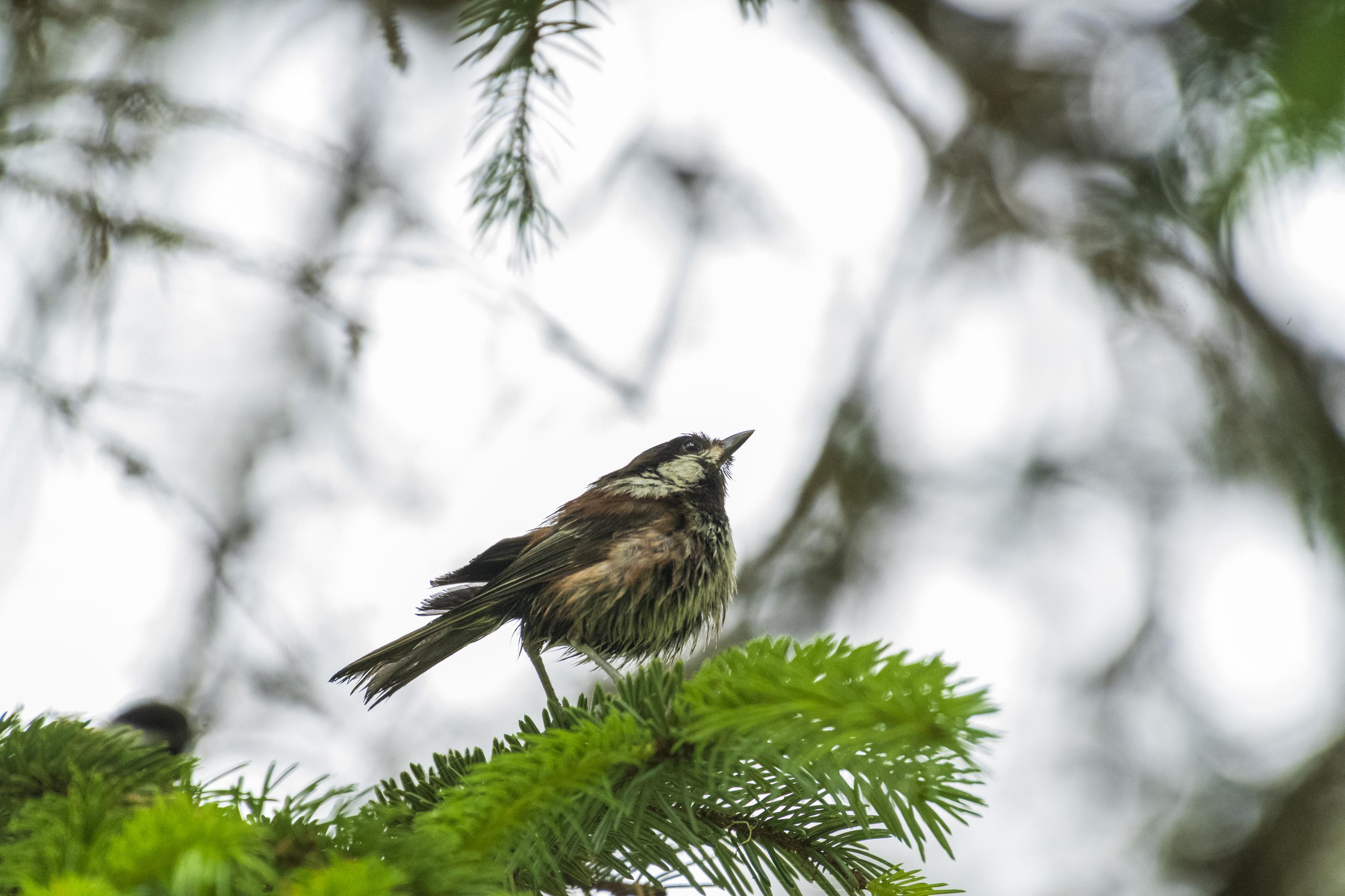A chestnut-backed chickadee perched on a leaf branch of a pine tree. This one looks particularly wet, with its belly feathers looking soaked, and also the feathers around its face and the tips of its tail.