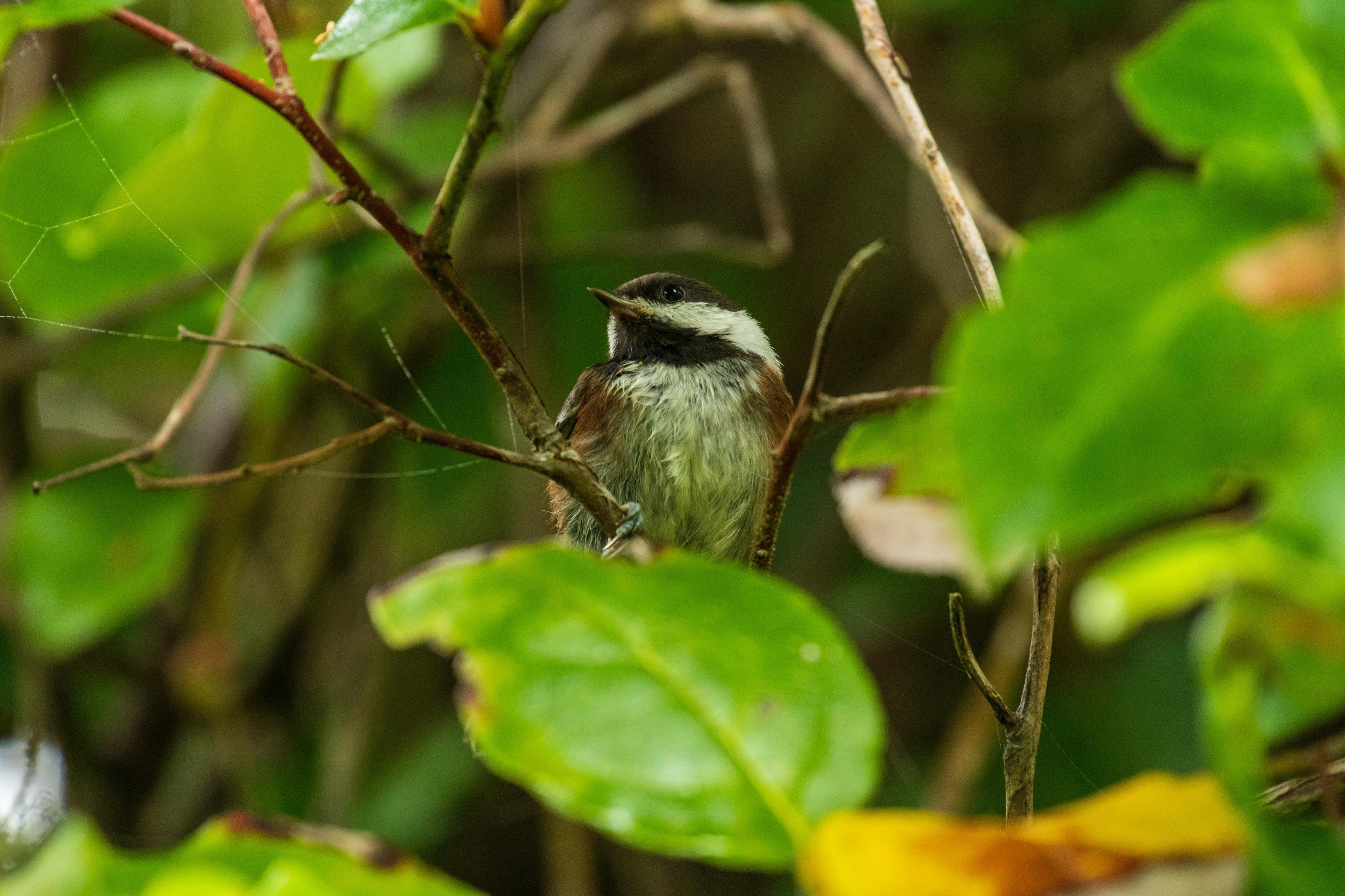 Another chestnut-backed chickadee, now perched in a twig of a leafy bush in the undergrowth. It doesn’t look s wet as the previous one, but still somewhat wet.