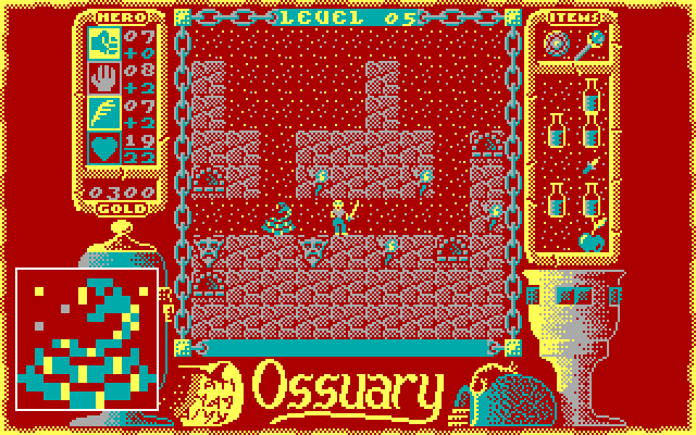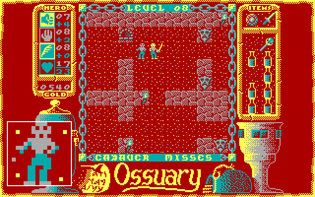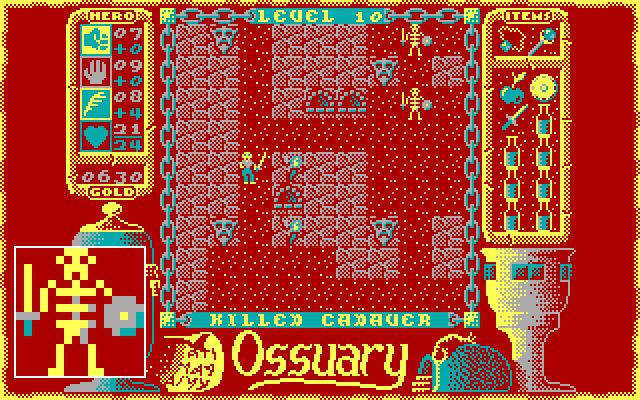 In centuries past, when the land was often at war, many of the citizens buried in the #Ossuary were brave warriors who had fallen in battle. The necromancer has reanimated their bleached bones, and now they wander the corridors and chambers, mistaking the living for their enemies from days gone by. They still draw strength from their tarnished sword and shield. You can download the game from https://cyningstan.itch.io/ossuary #ibmpc #msdos #cga