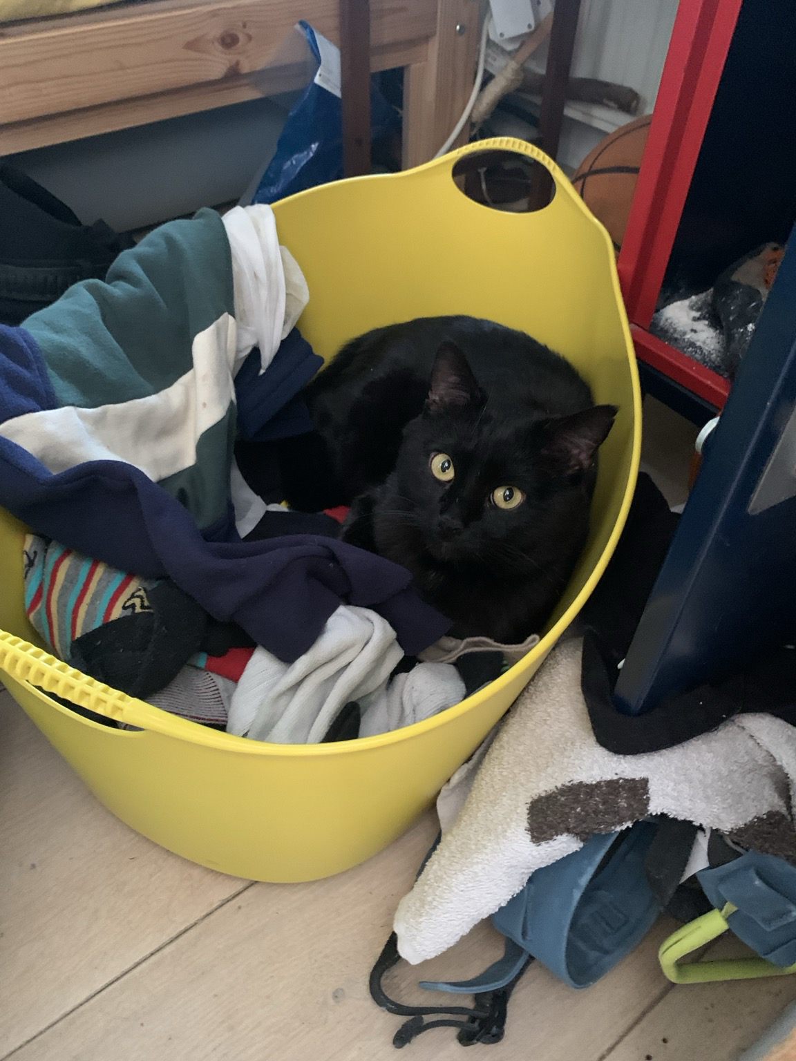 Collection of #Grapje (black cat) 🐈⬛ photos for this #caturday : selfie together while reunited after holidays! ; belly rubs invite ; chilling in the hamper ; having breakfast together : shared life! #CatsOfMastodon