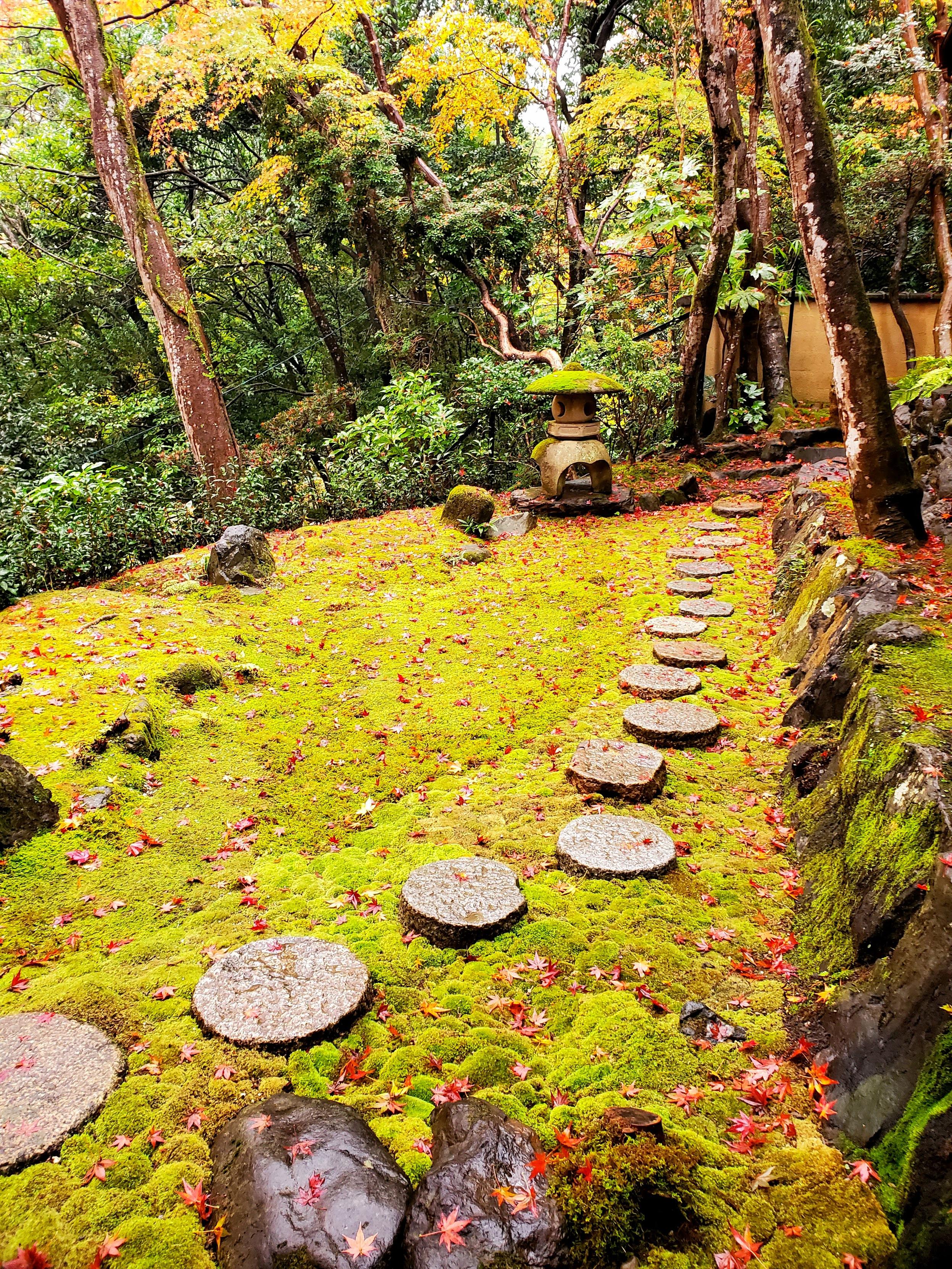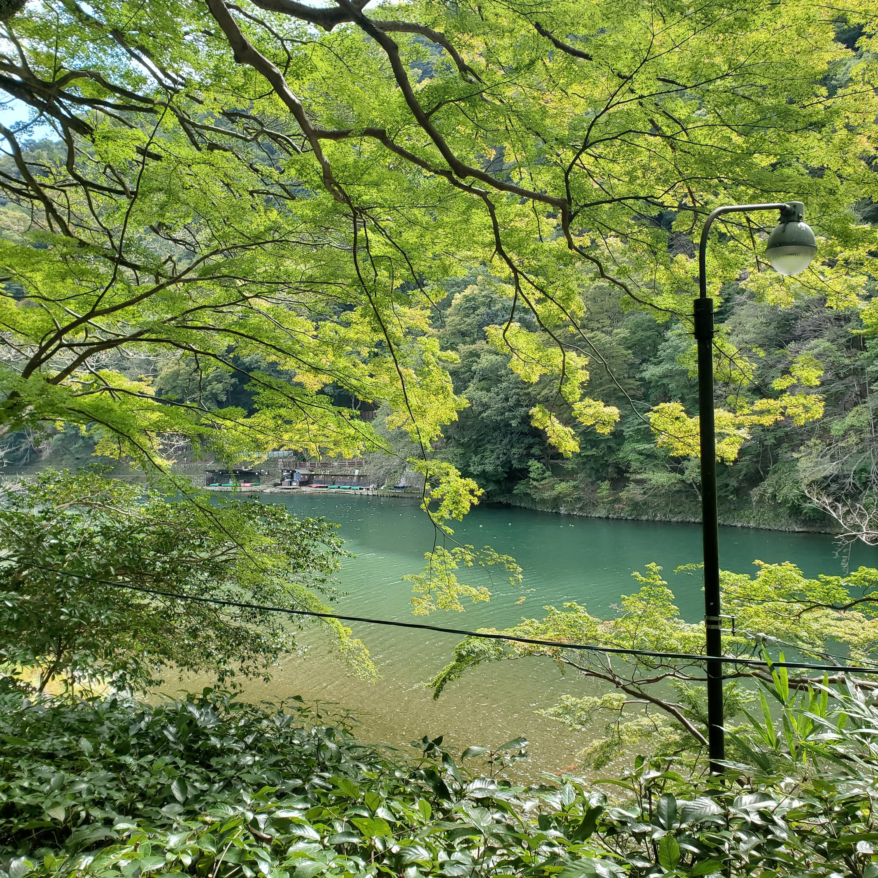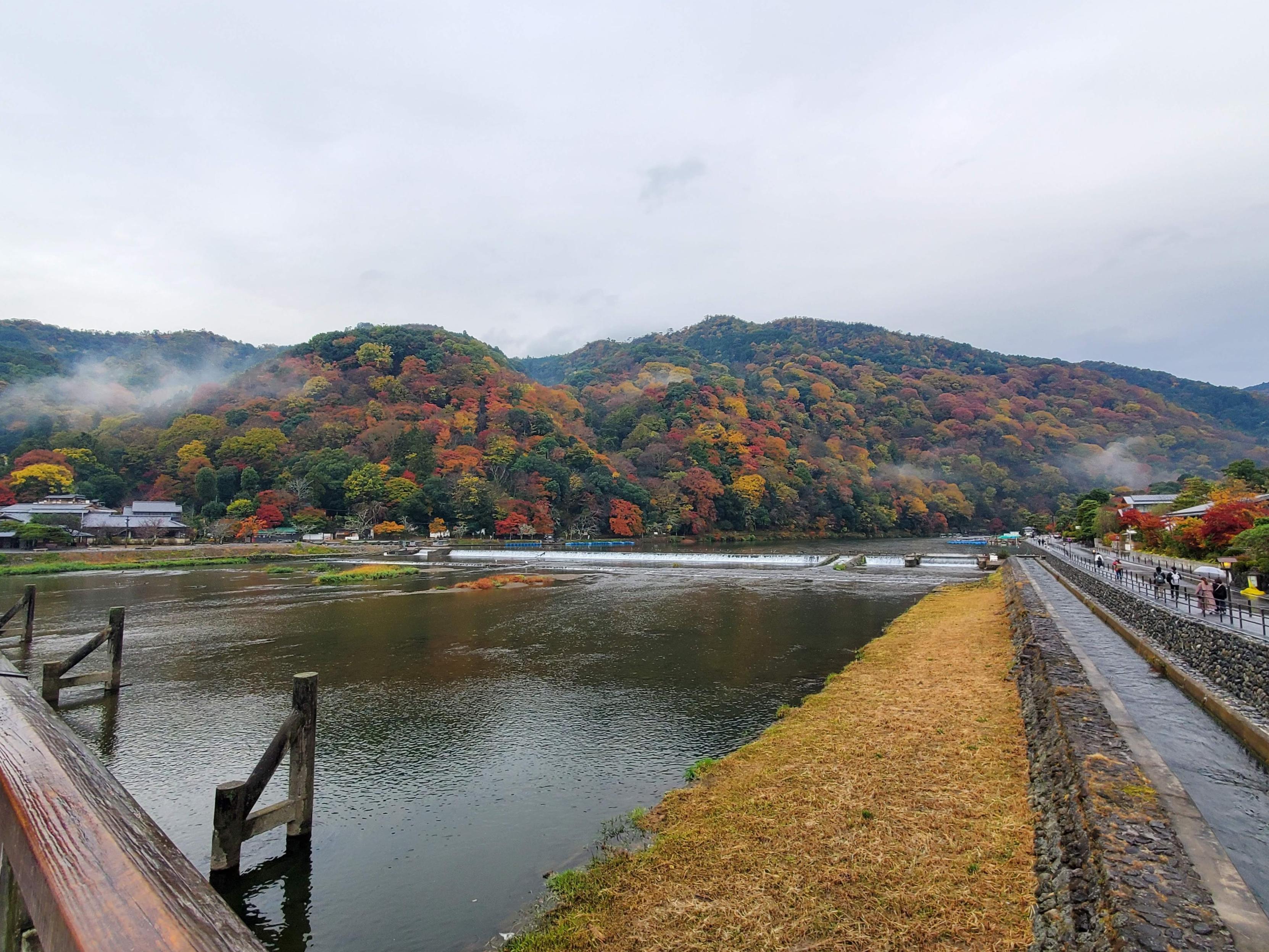 The mountains slowly become a patchwork of colour as autumn deepens in Arashiyama.