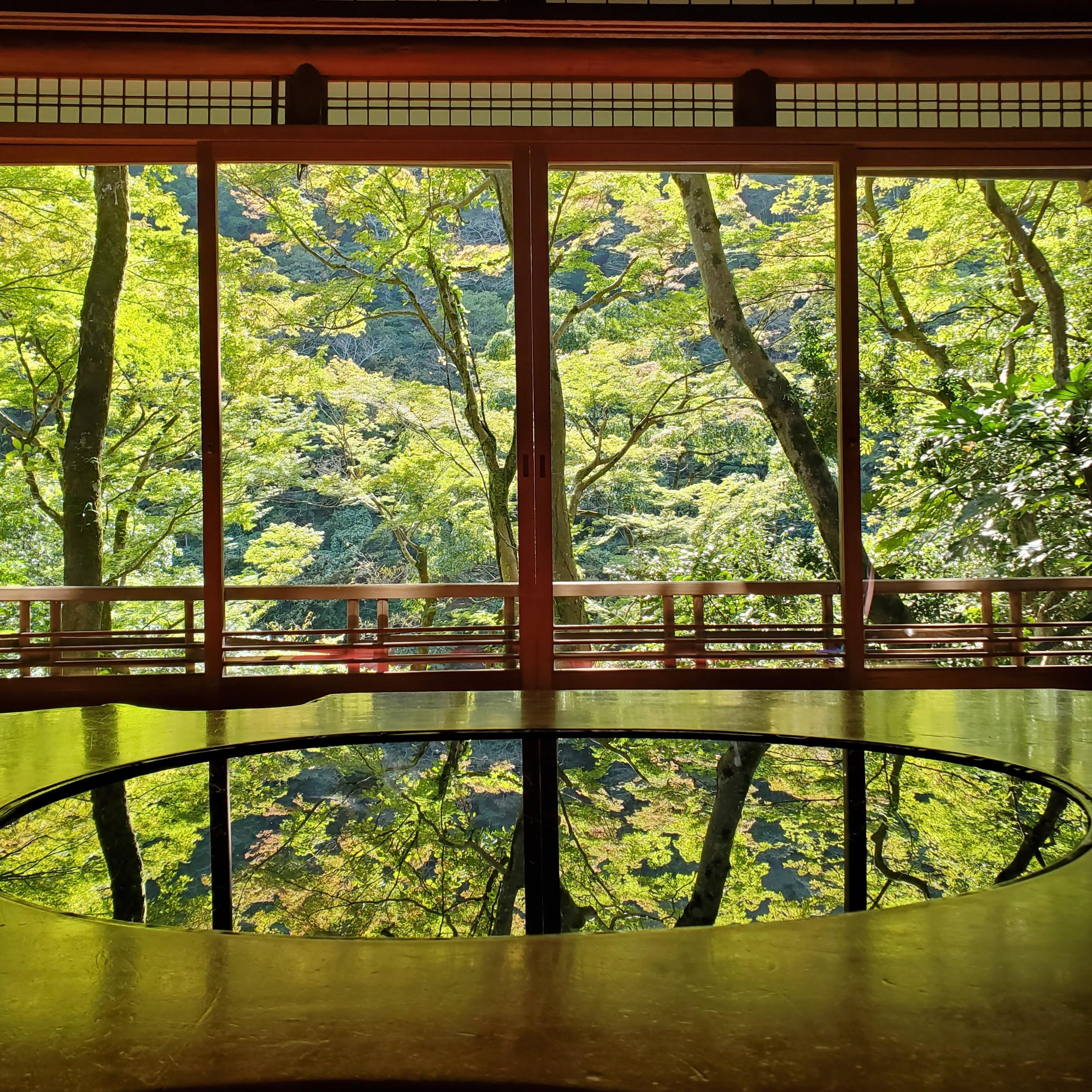 The fresh leaves of early summer reflected in a table at Yusai-tei.