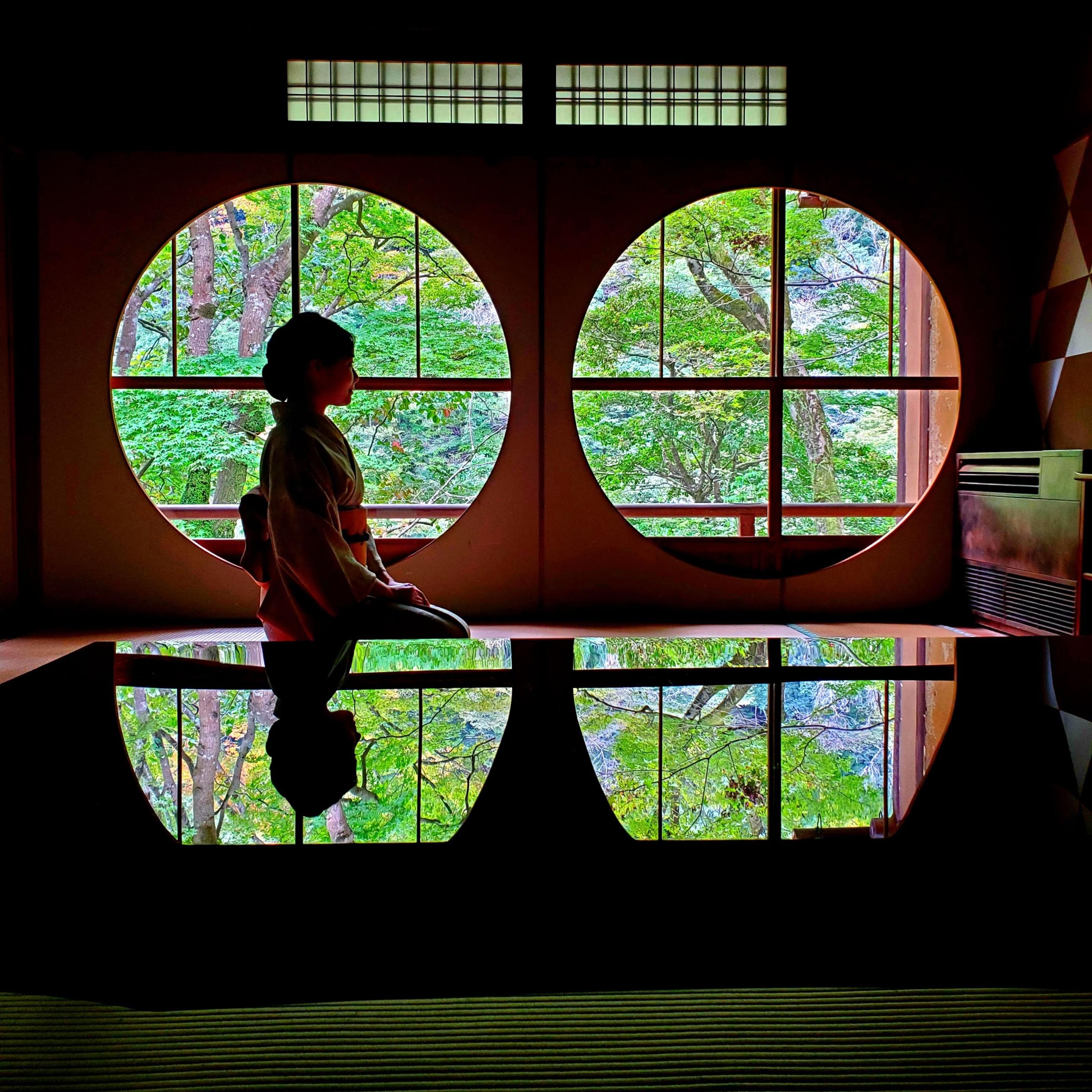 Nao-san models in front of the round windows at Yusai-tei during the lush early summer.