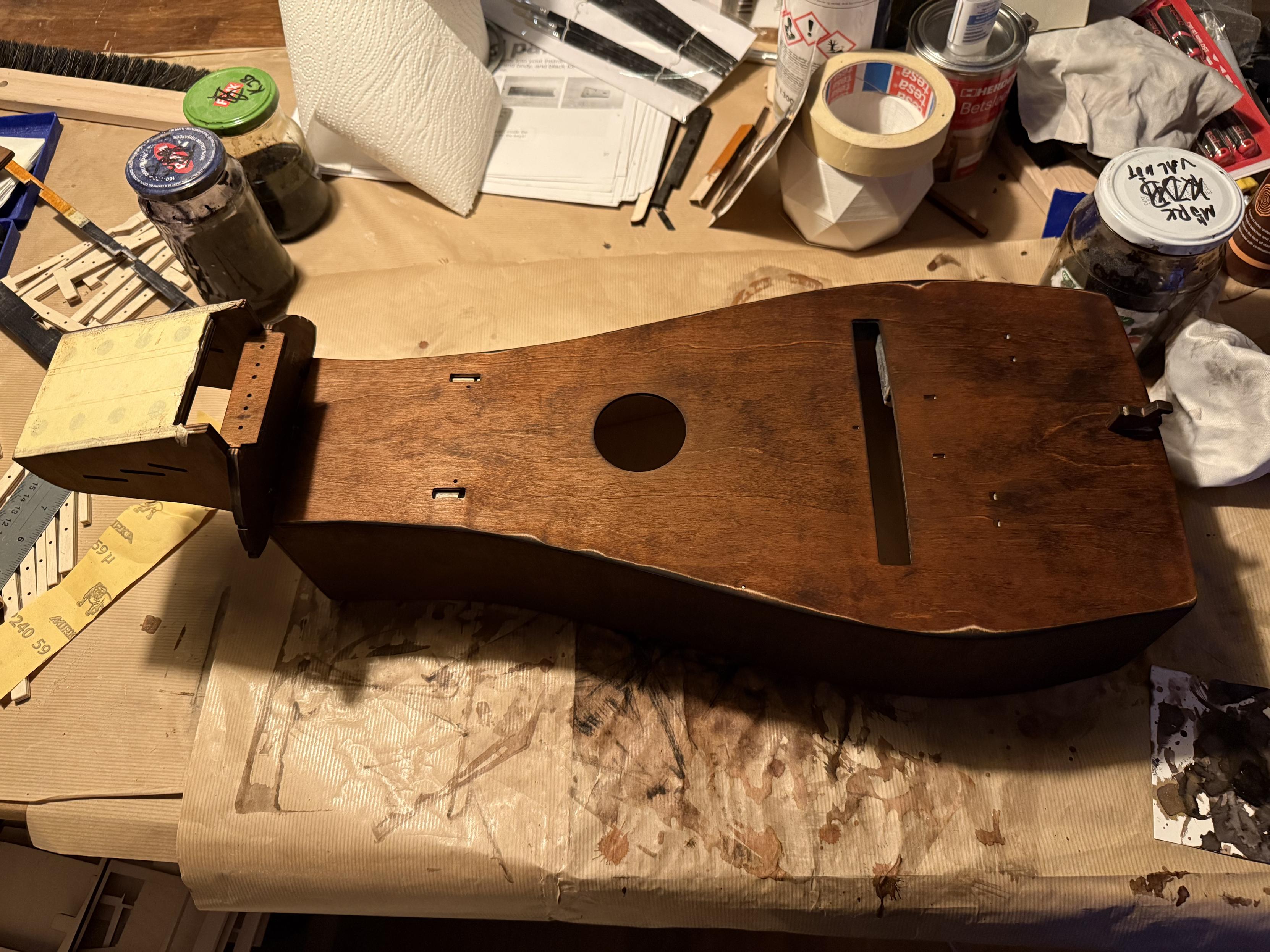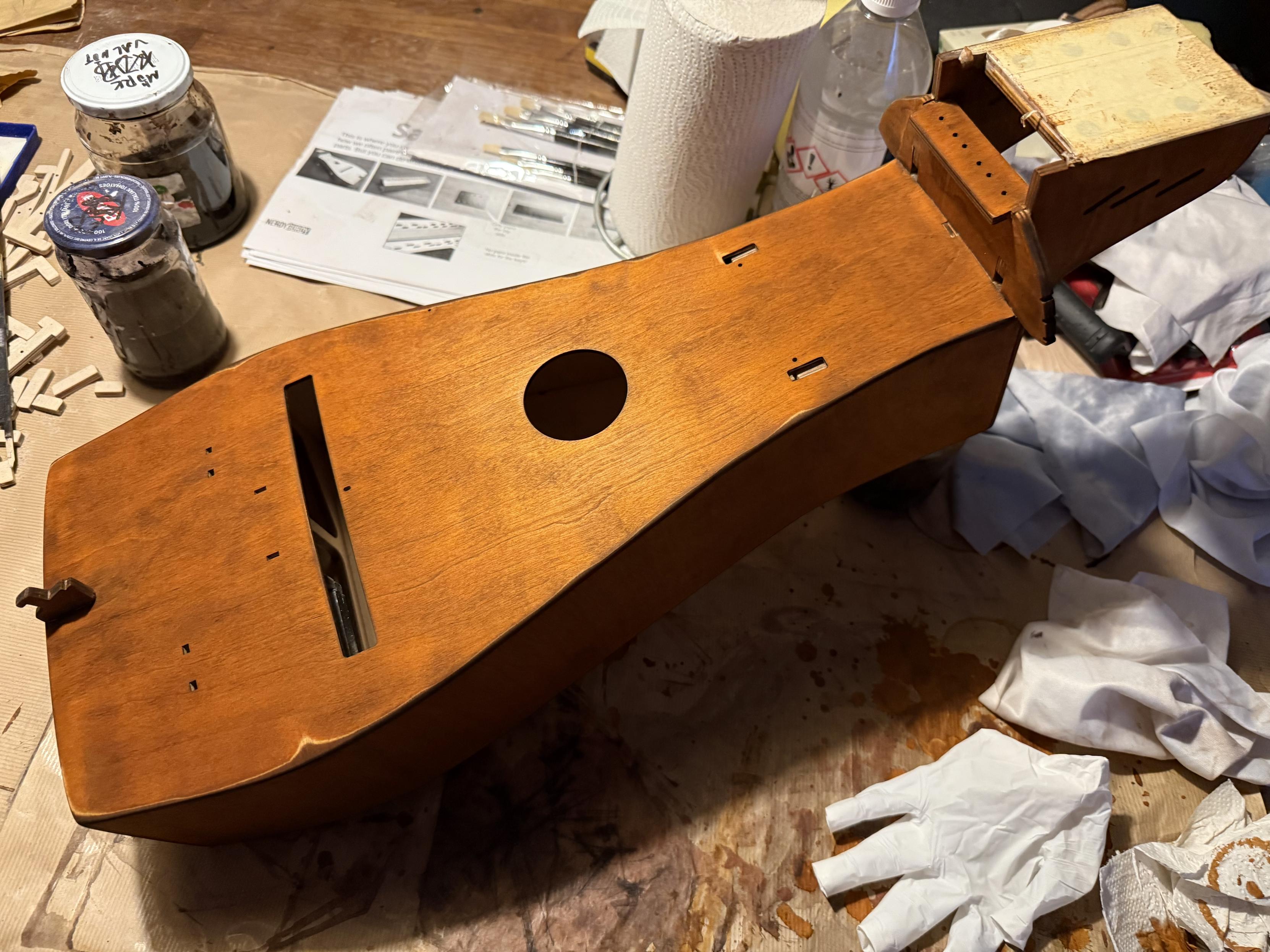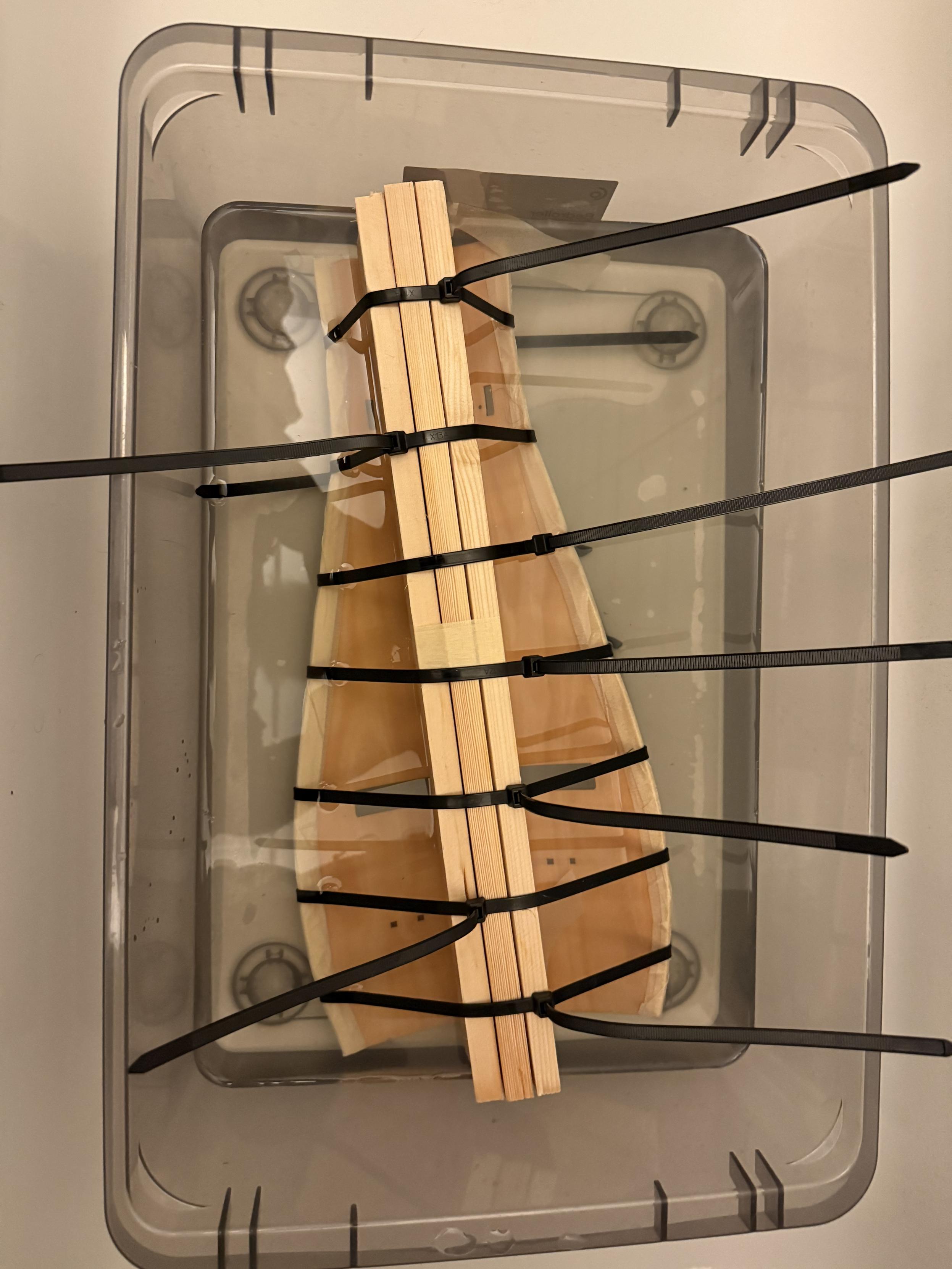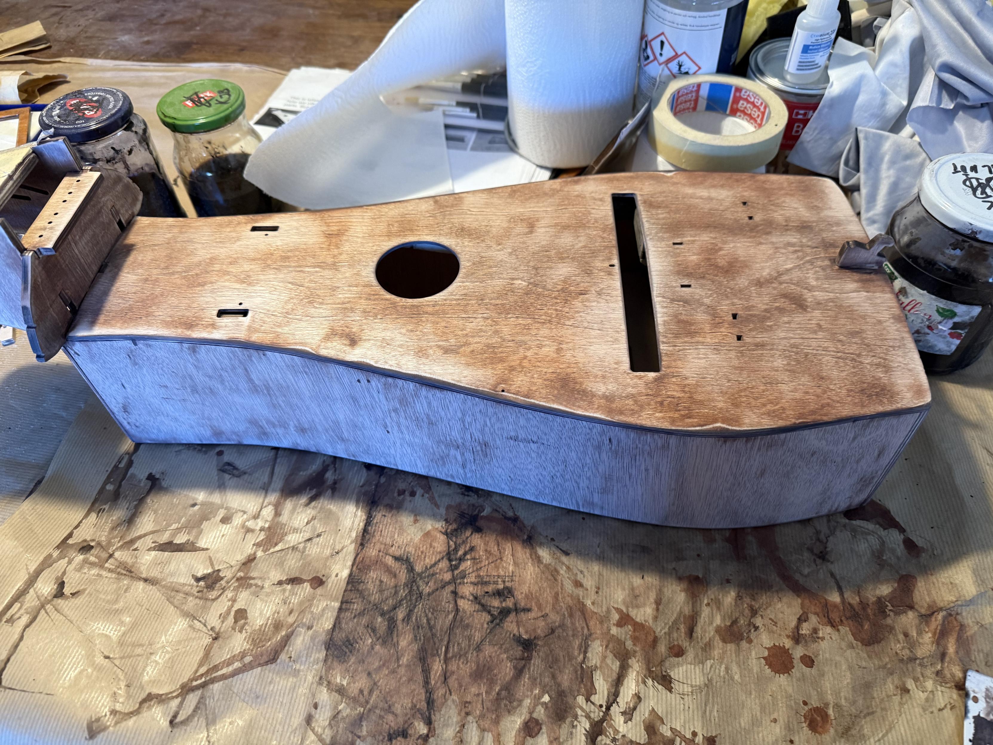 The bending is done, and the plywood top plate is lying on a table. It has masking tape on the edges, and cable ties still around it, and it is noticeably bent. Behind it is the body of the hurdy gurdy waiting to have the bent plywood piece glued to it.