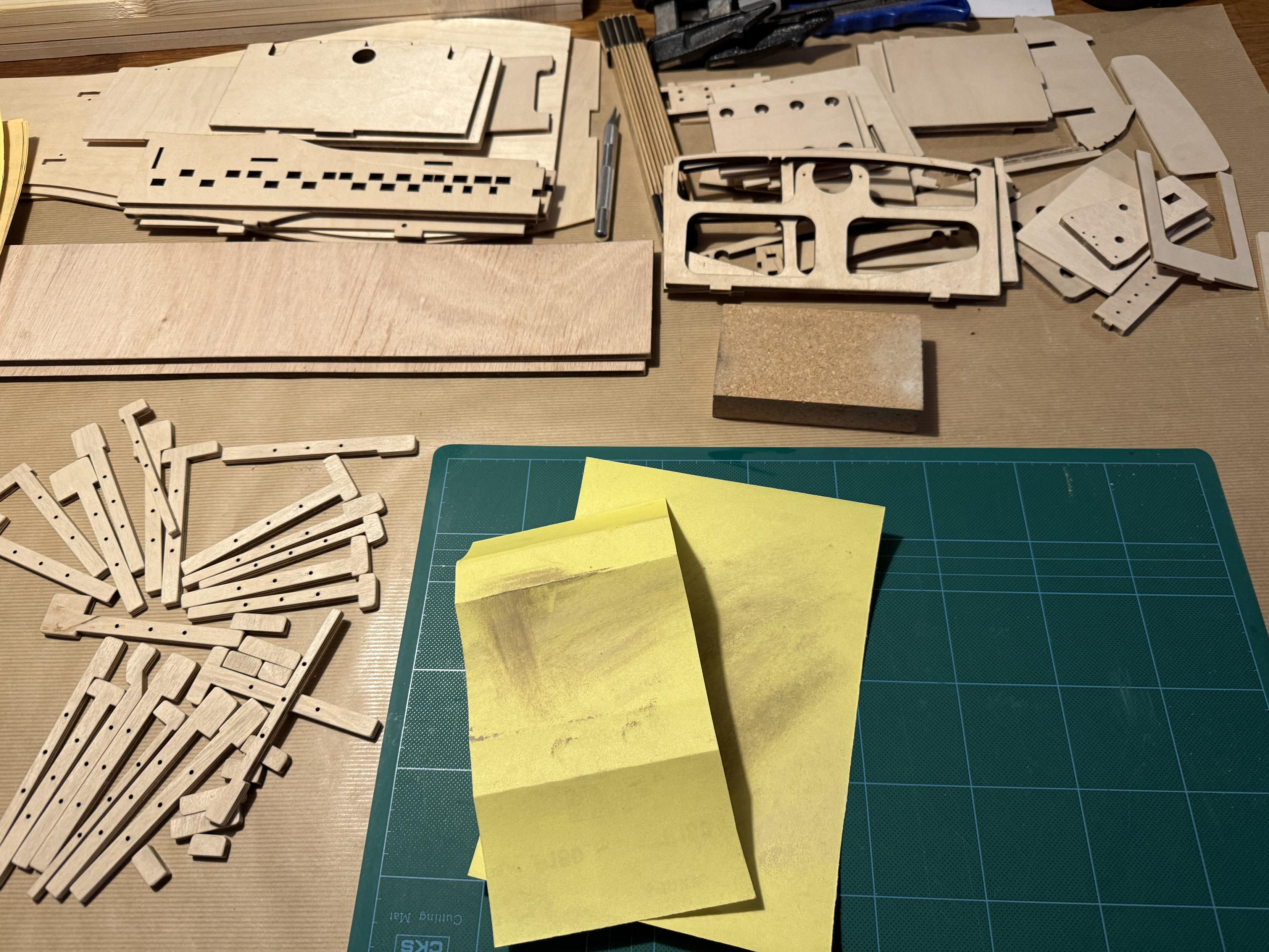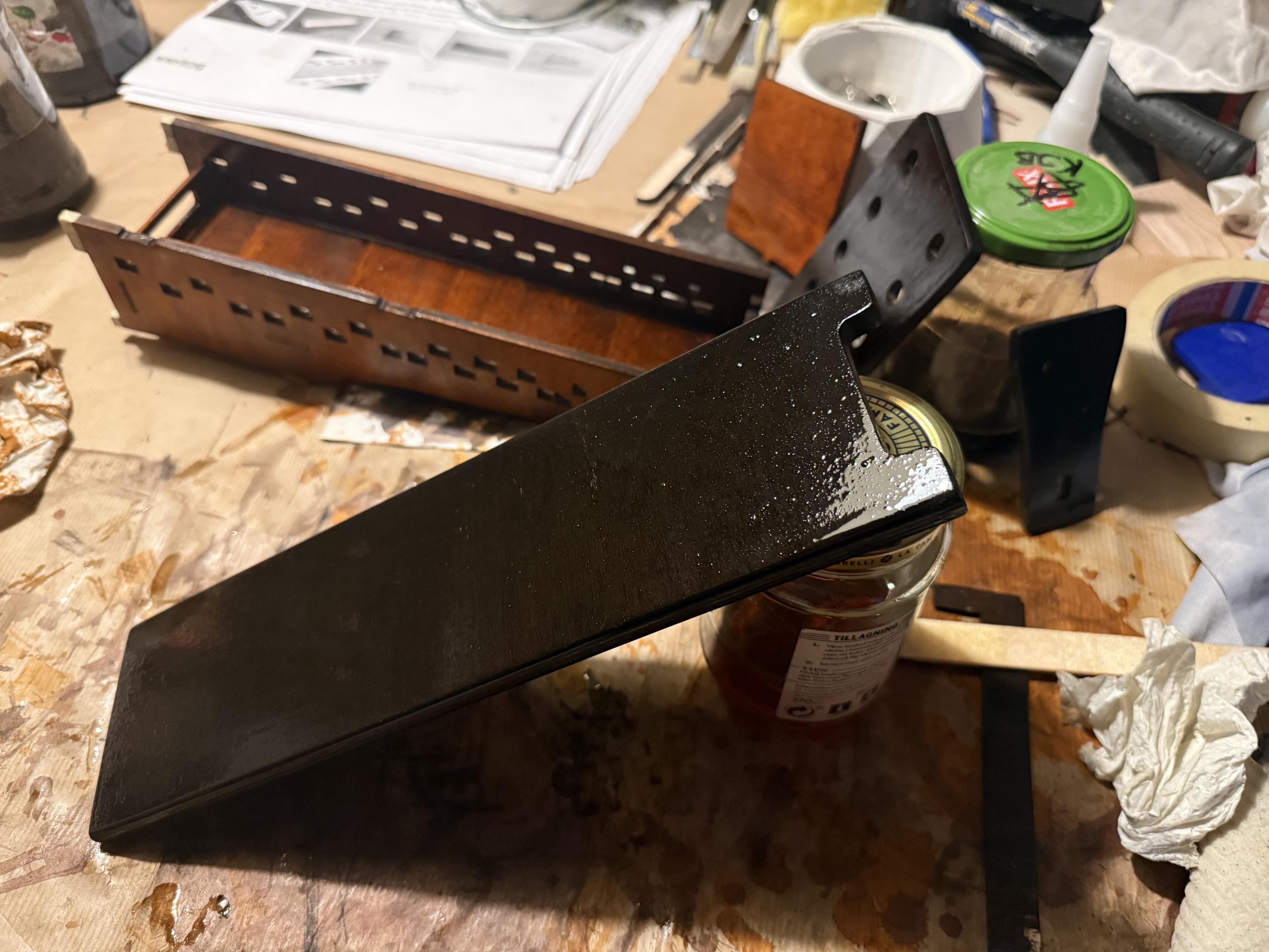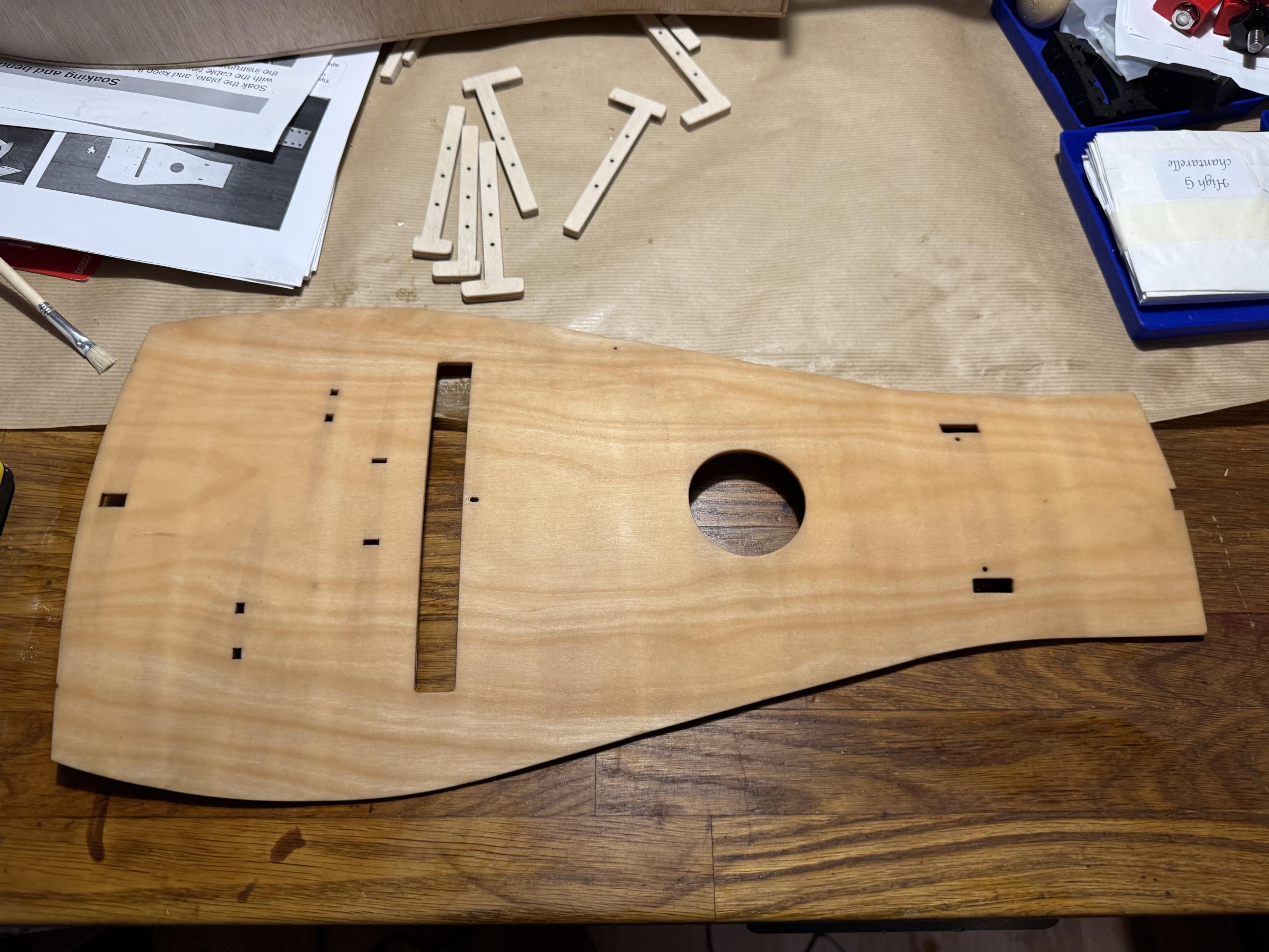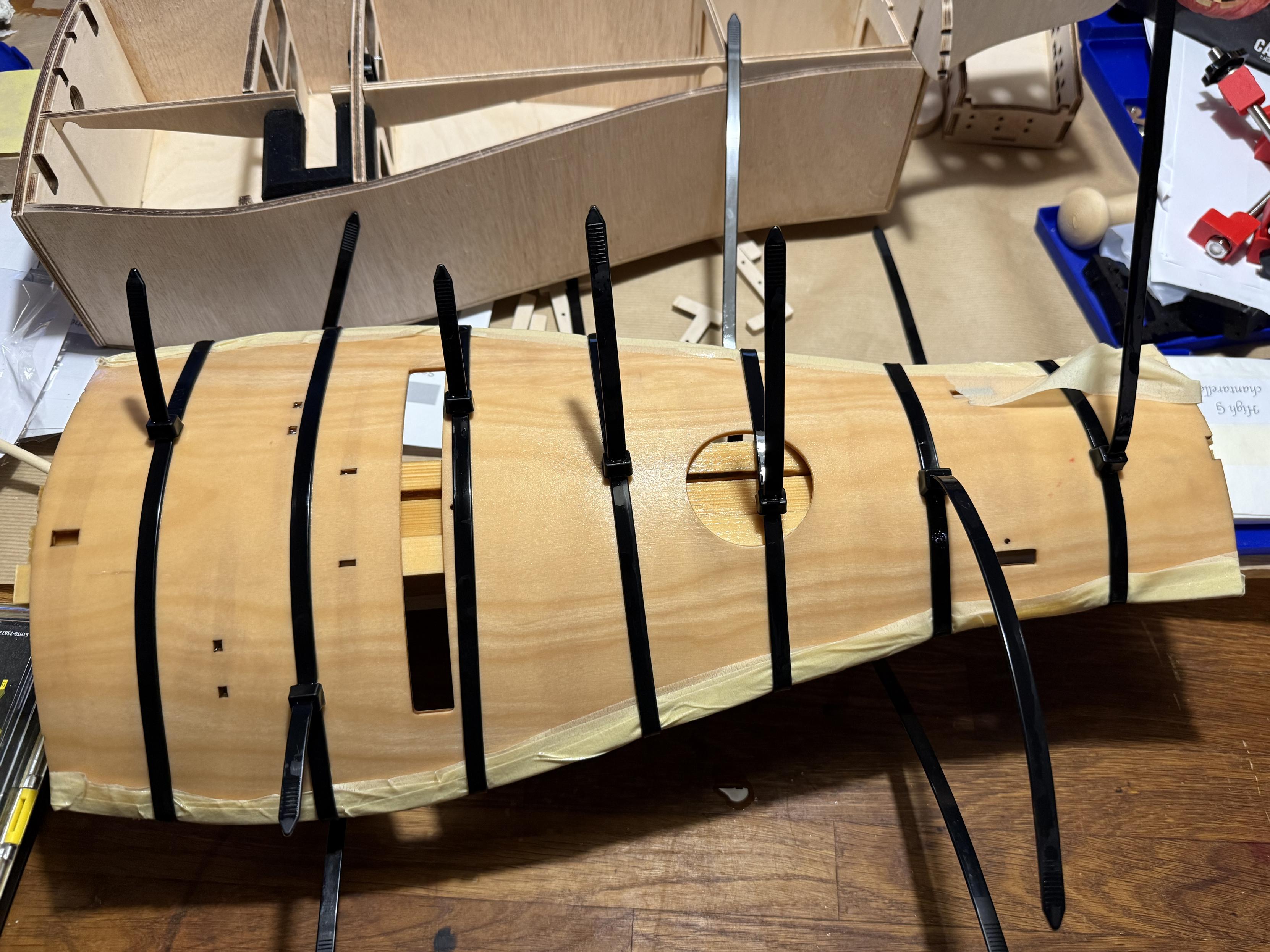 The bending is done, and the plywood top plate is lying on a table. It has masking tape on the edges, and cable ties still around it, and it is noticeably bent. Behind it is the body of the hurdy gurdy waiting to have the bent plywood piece glued to it.