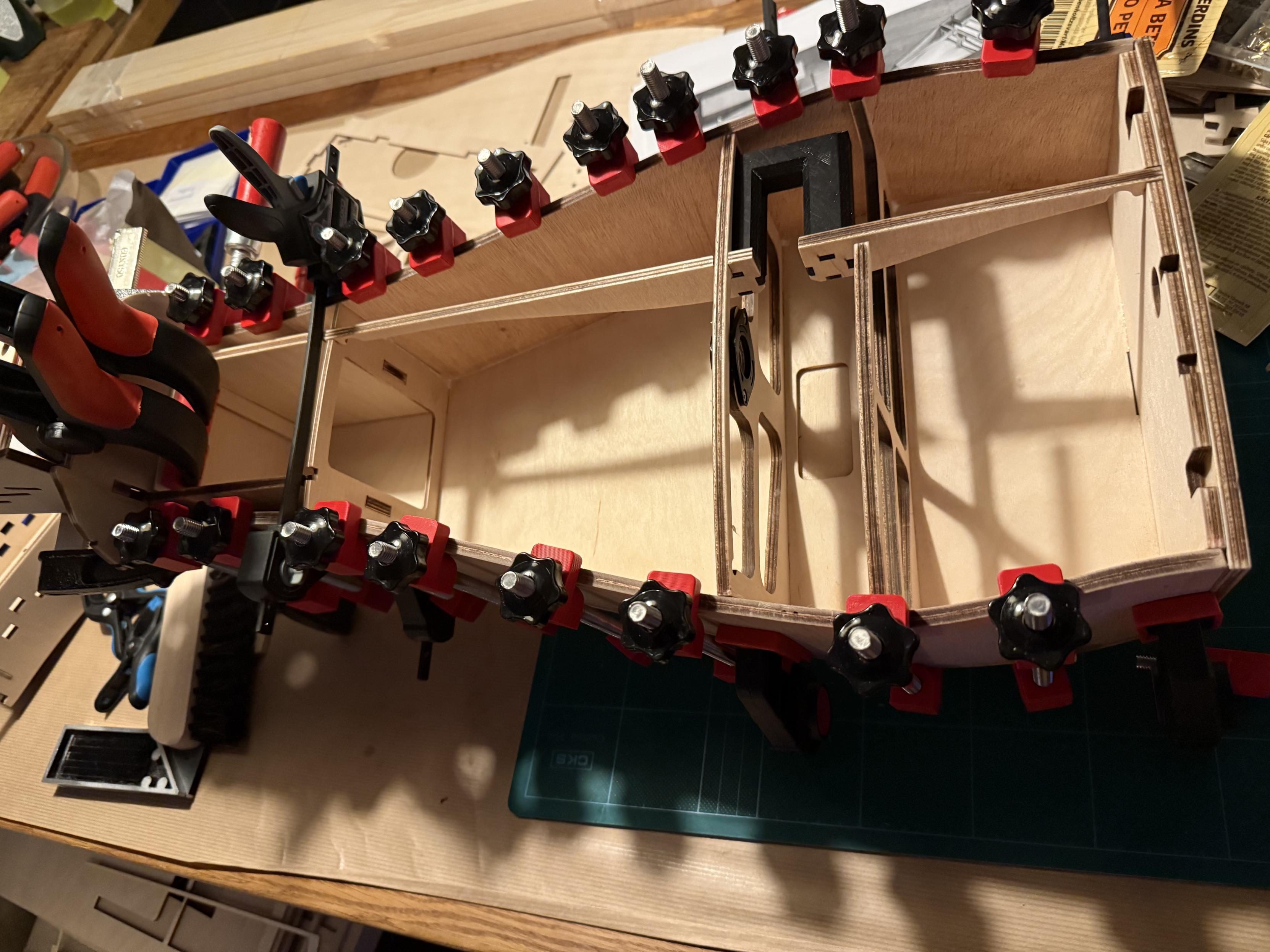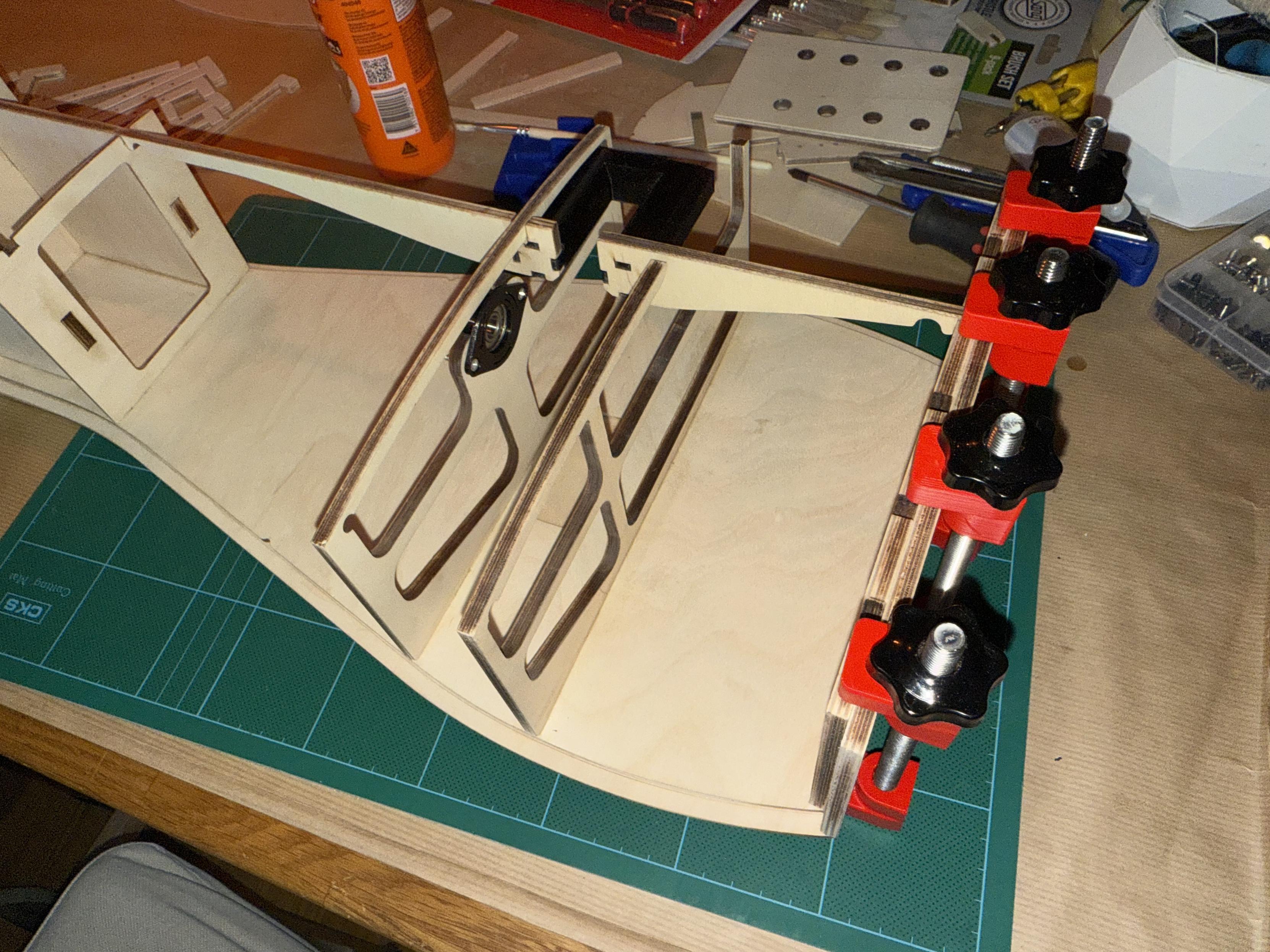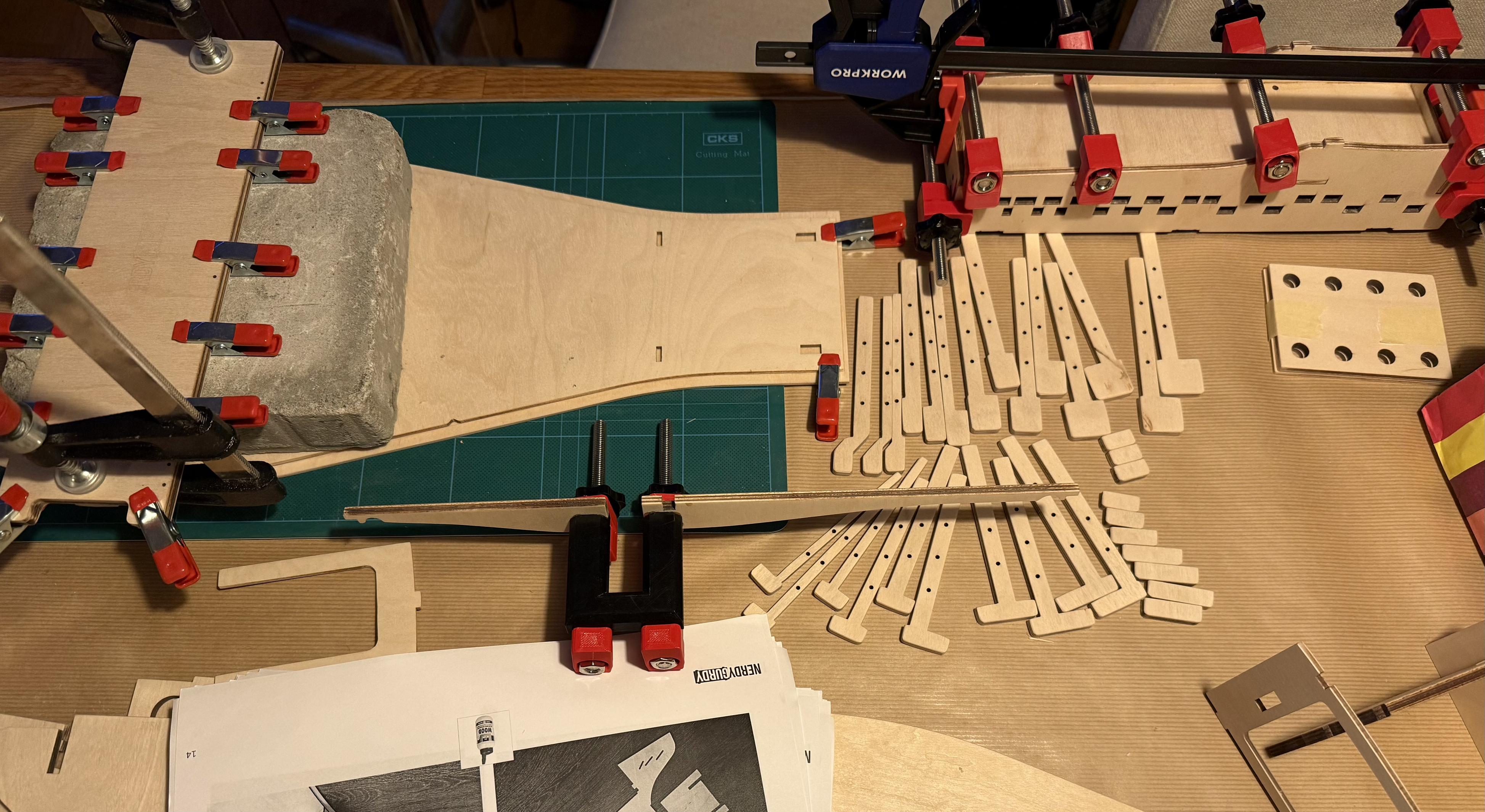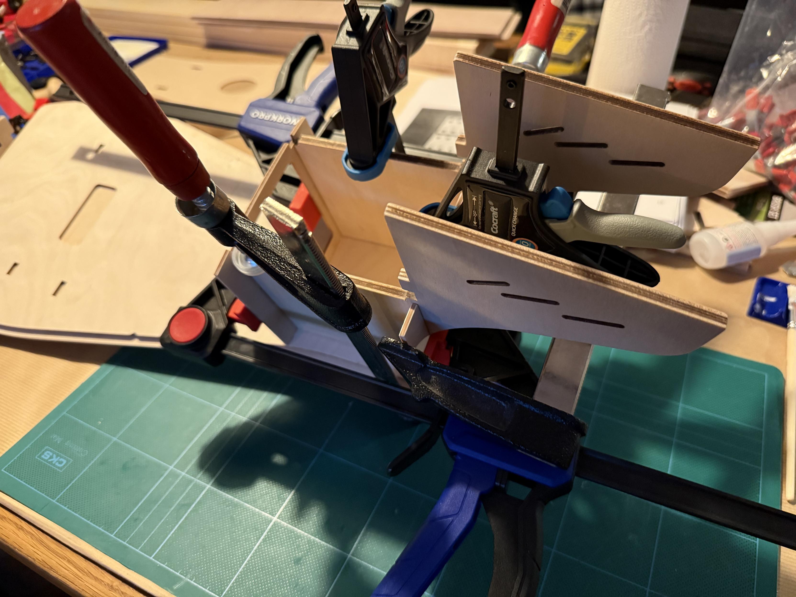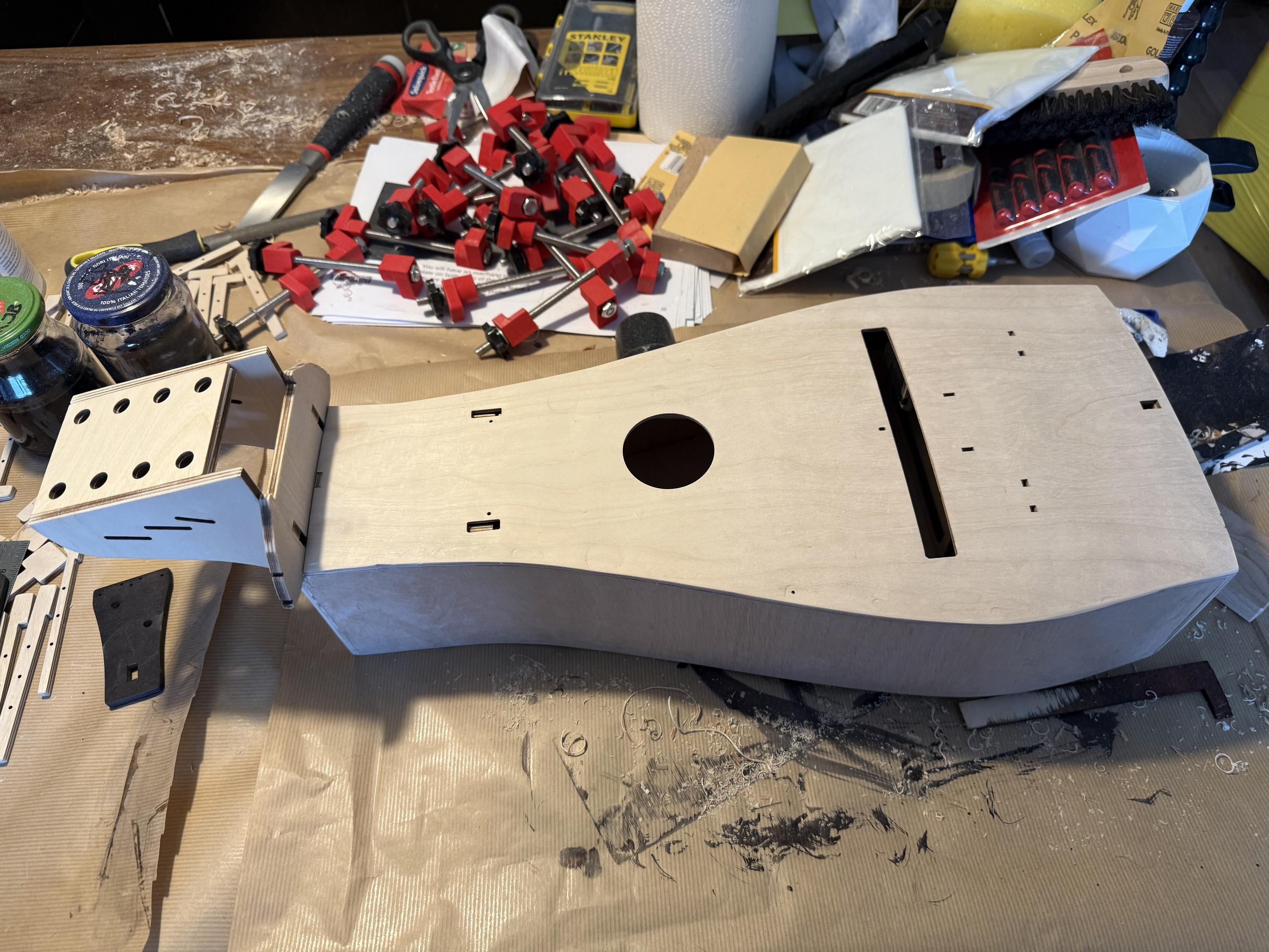 The bent piece of plywood is glued on the top of the body of the hurdy gurdy. There are twenty small glue clamps all along the sides of the body. There are more clamps sticking out of holes in the top plate. There are bigger clue clamps in the corners of the body.