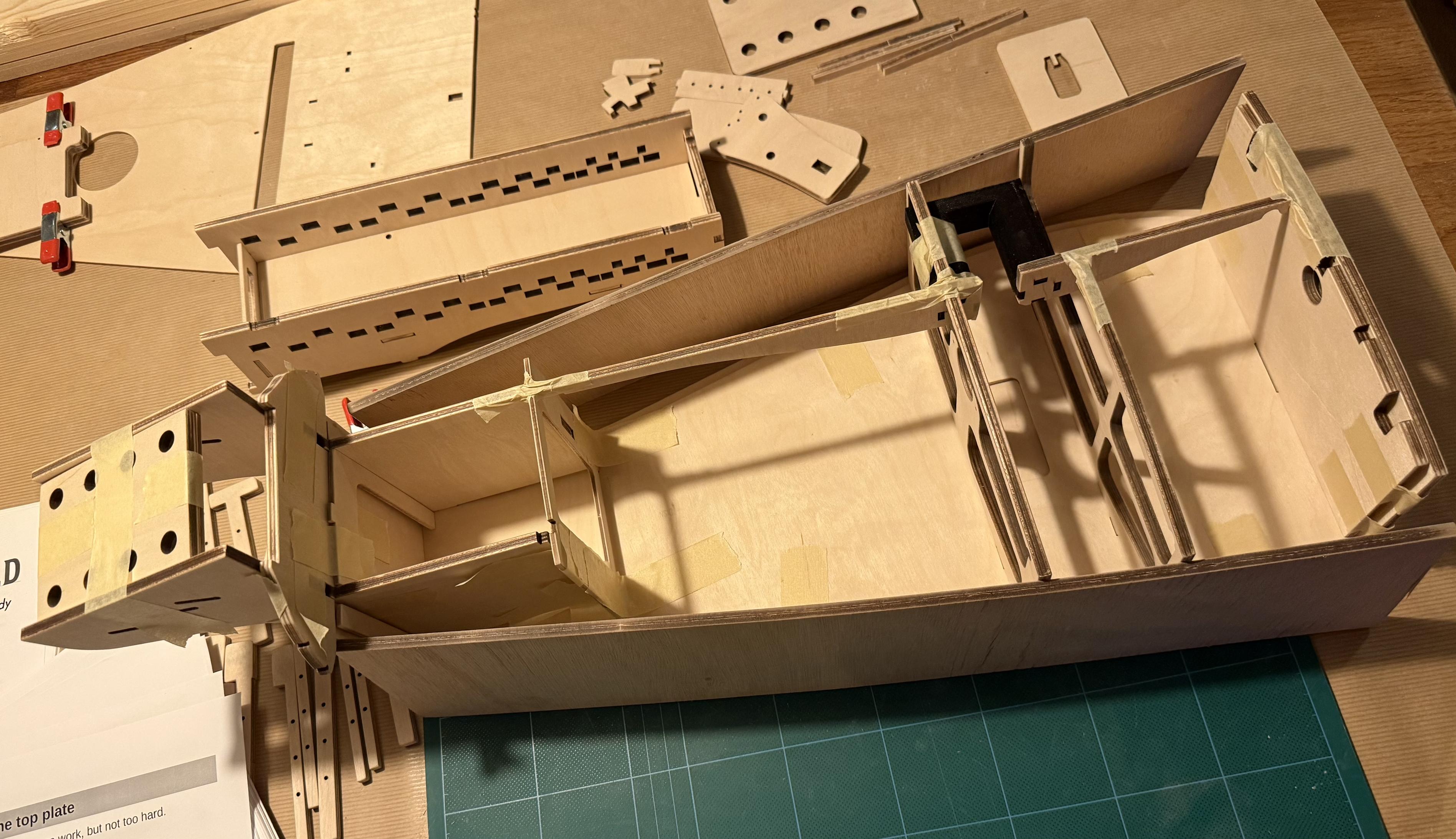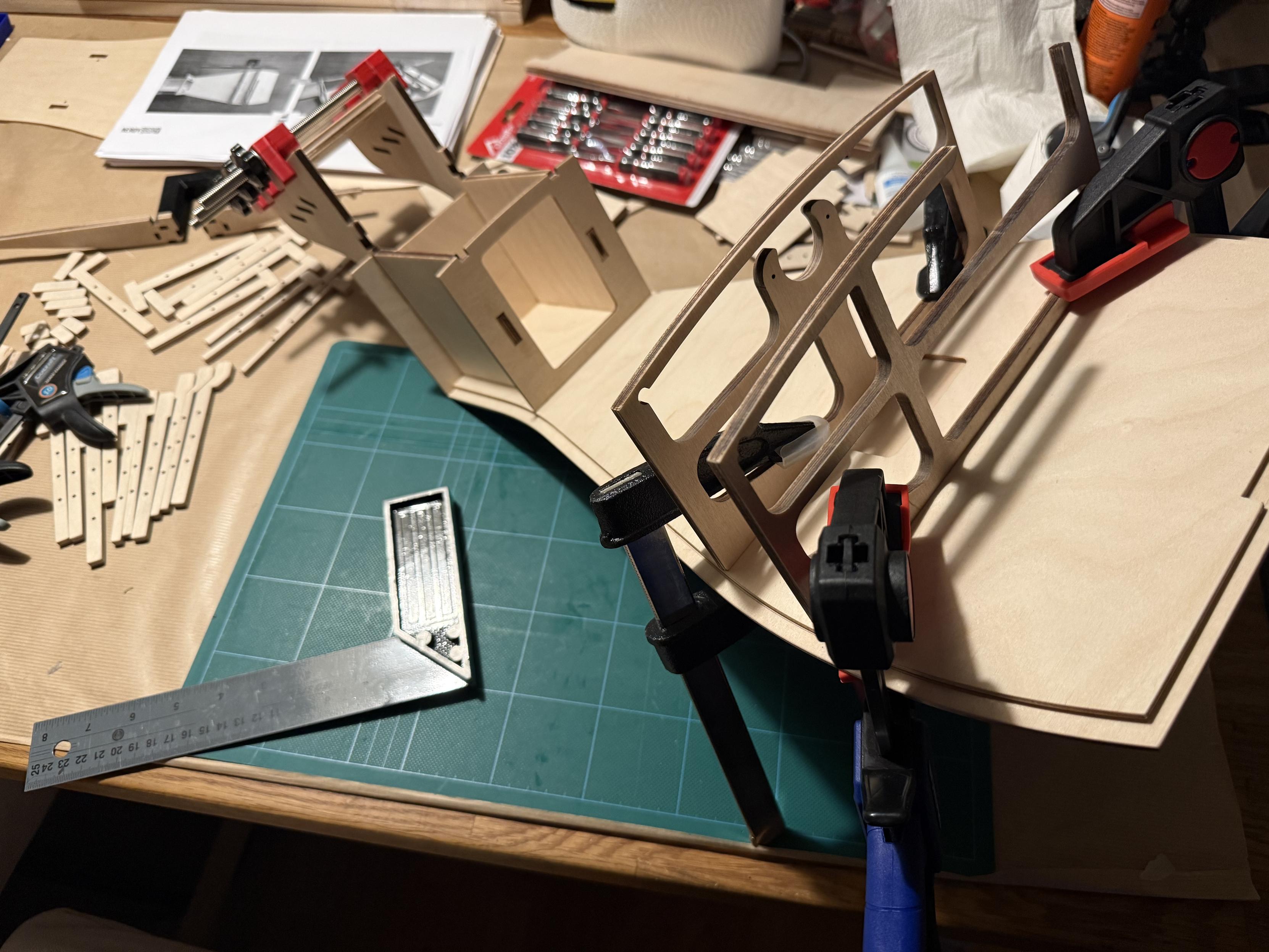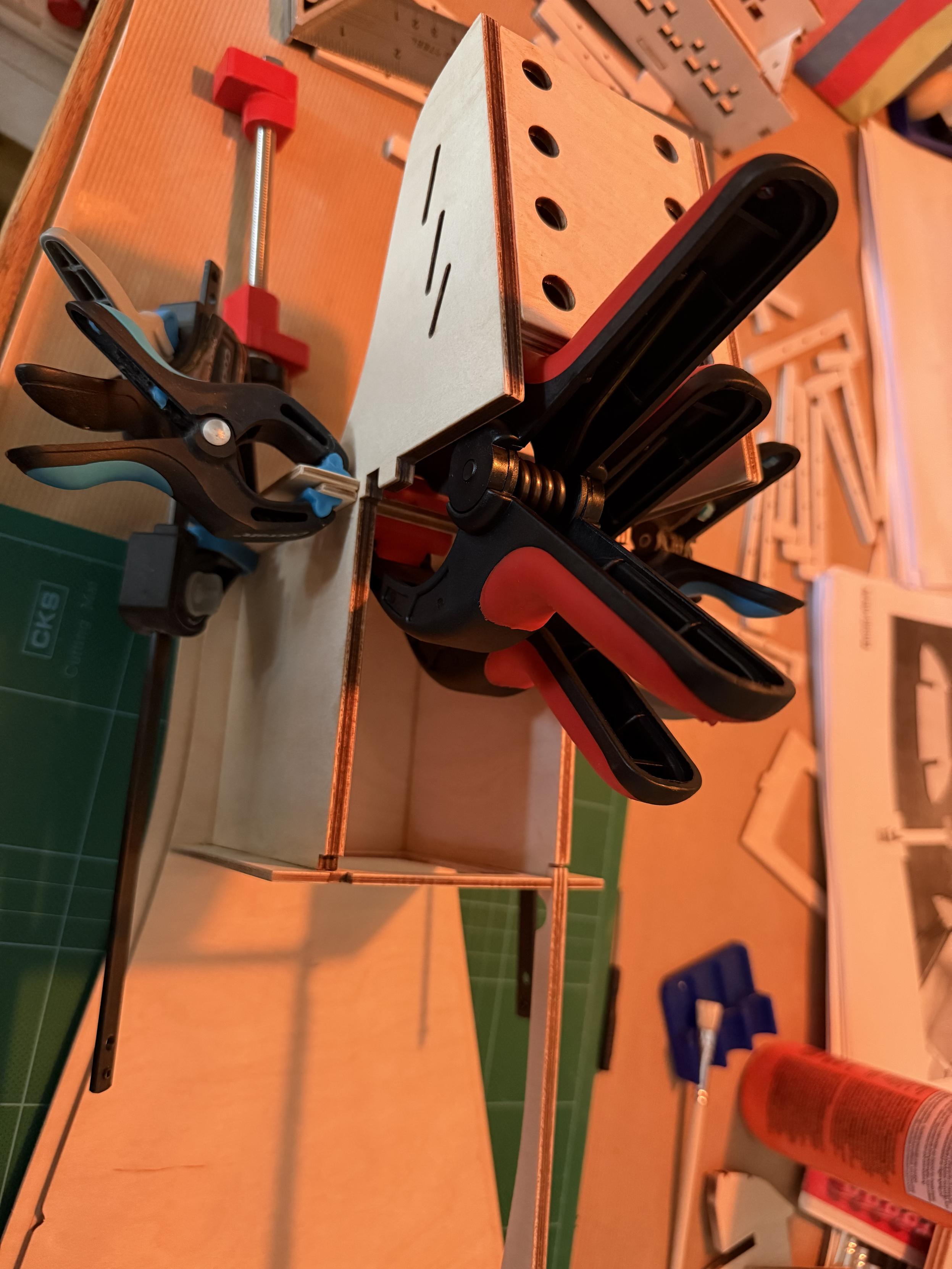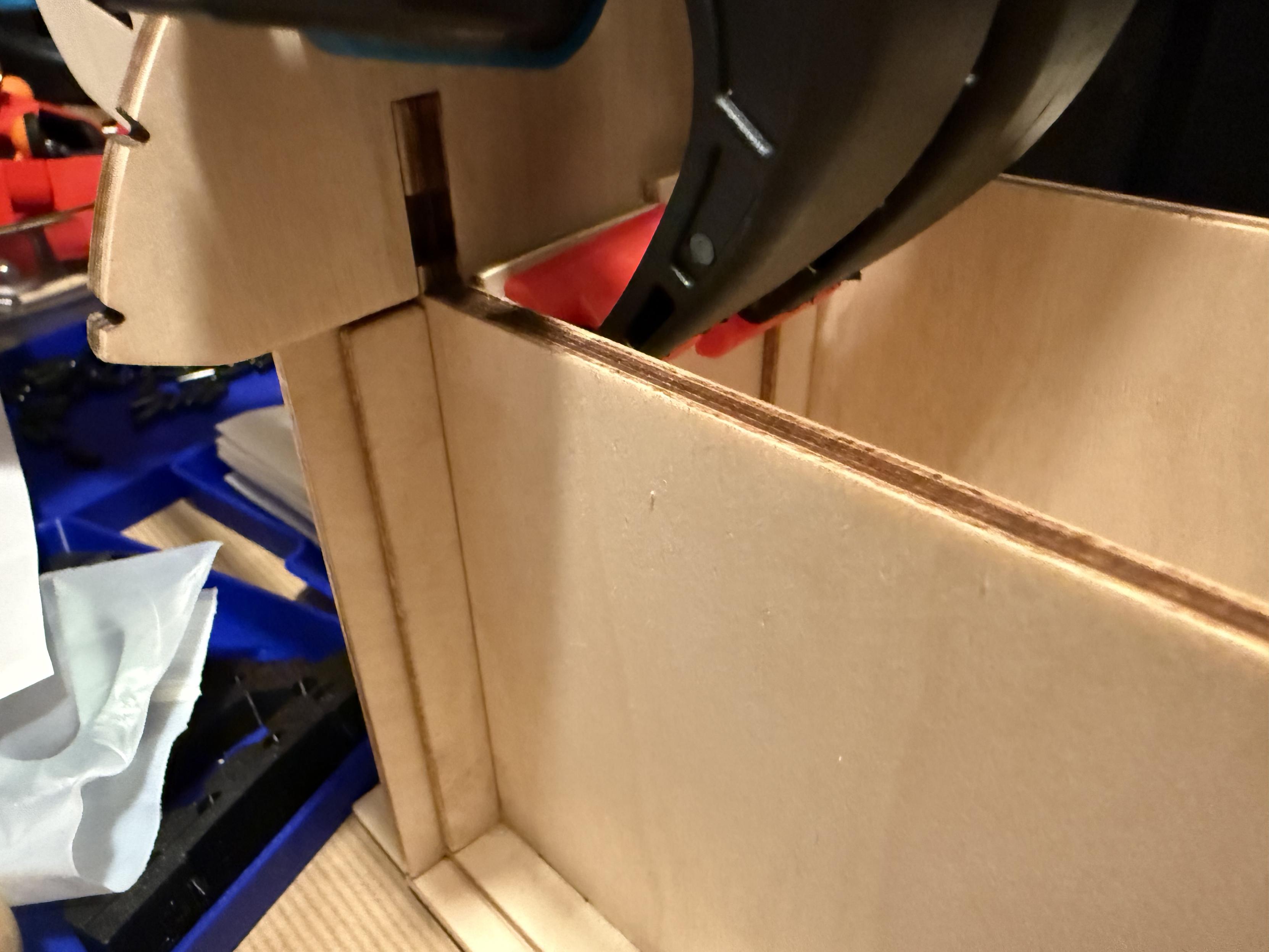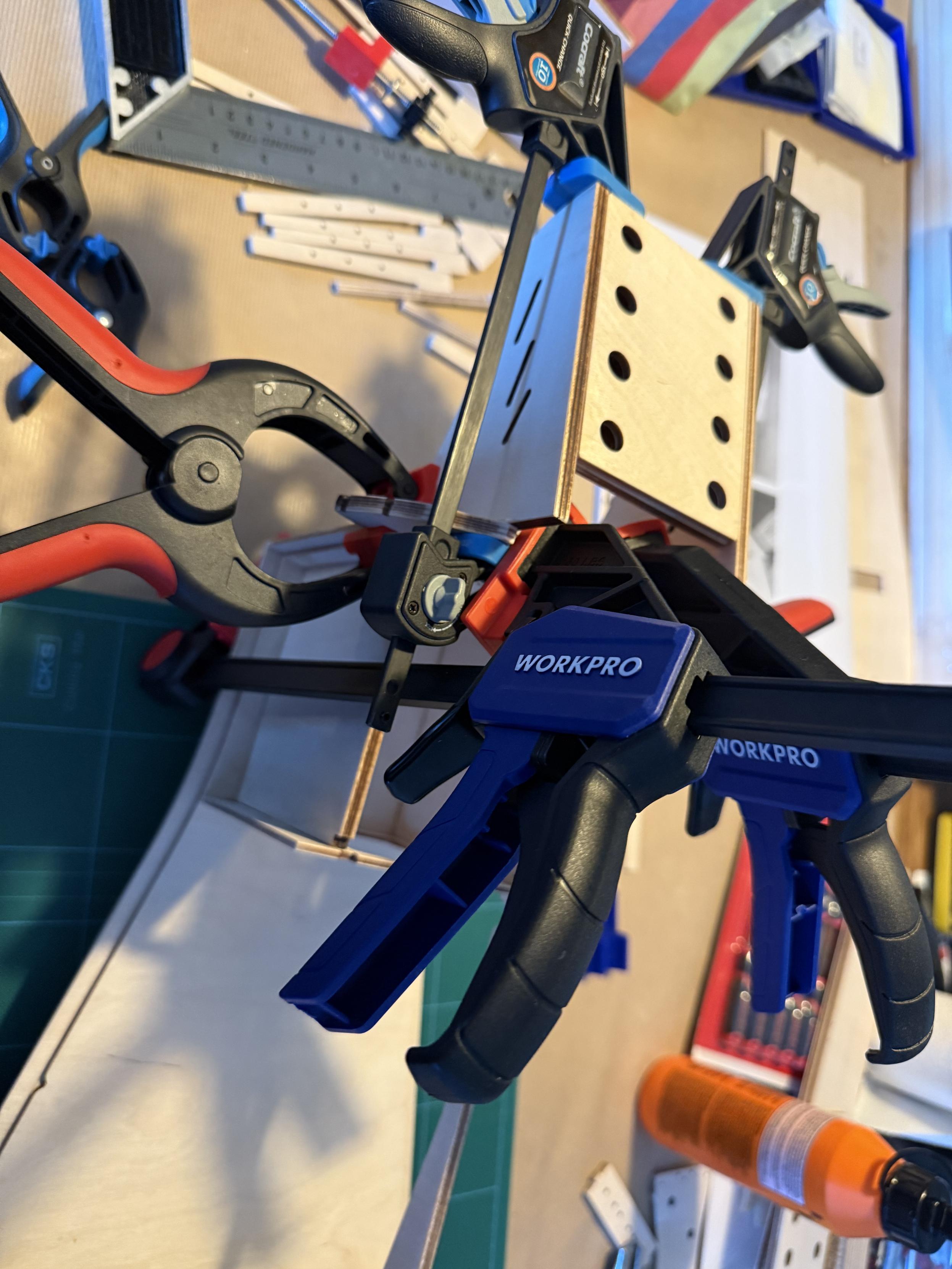 The bent piece of plywood is glued on the top of the body of the hurdy gurdy. There are twenty small glue clamps all along the sides of the body. There are more clamps sticking out of holes in the top plate. There are bigger clue clamps in the corners of the body.