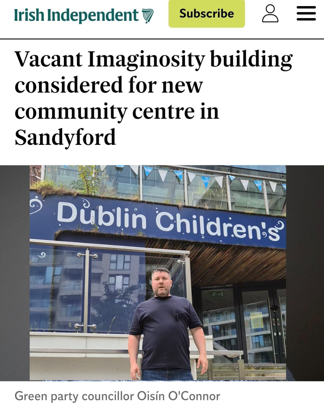 Thanks to Azmia Riaz of the Irish Independent for covering my repeated calls for new council-run community facilities at the vacant Imaginosity building in Sandyford.