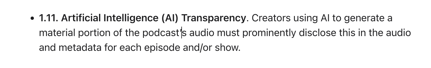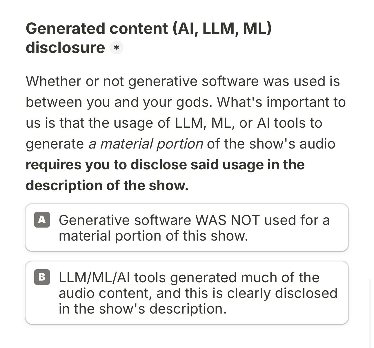 Generated content (Al, LLM, ML) disclosure * Whether or not generative software was used is between you and your gods. What's important to us is that the usage of LLM, ML, or Al tools to generate a material portion of the show's audio requires you to disclose said usage in the description of the show. A Generative software WAS NOT used for a material portion of this show. B LLM/ML/AI tools generated much of the audio content, and this is clearly disclosed in the show's description.