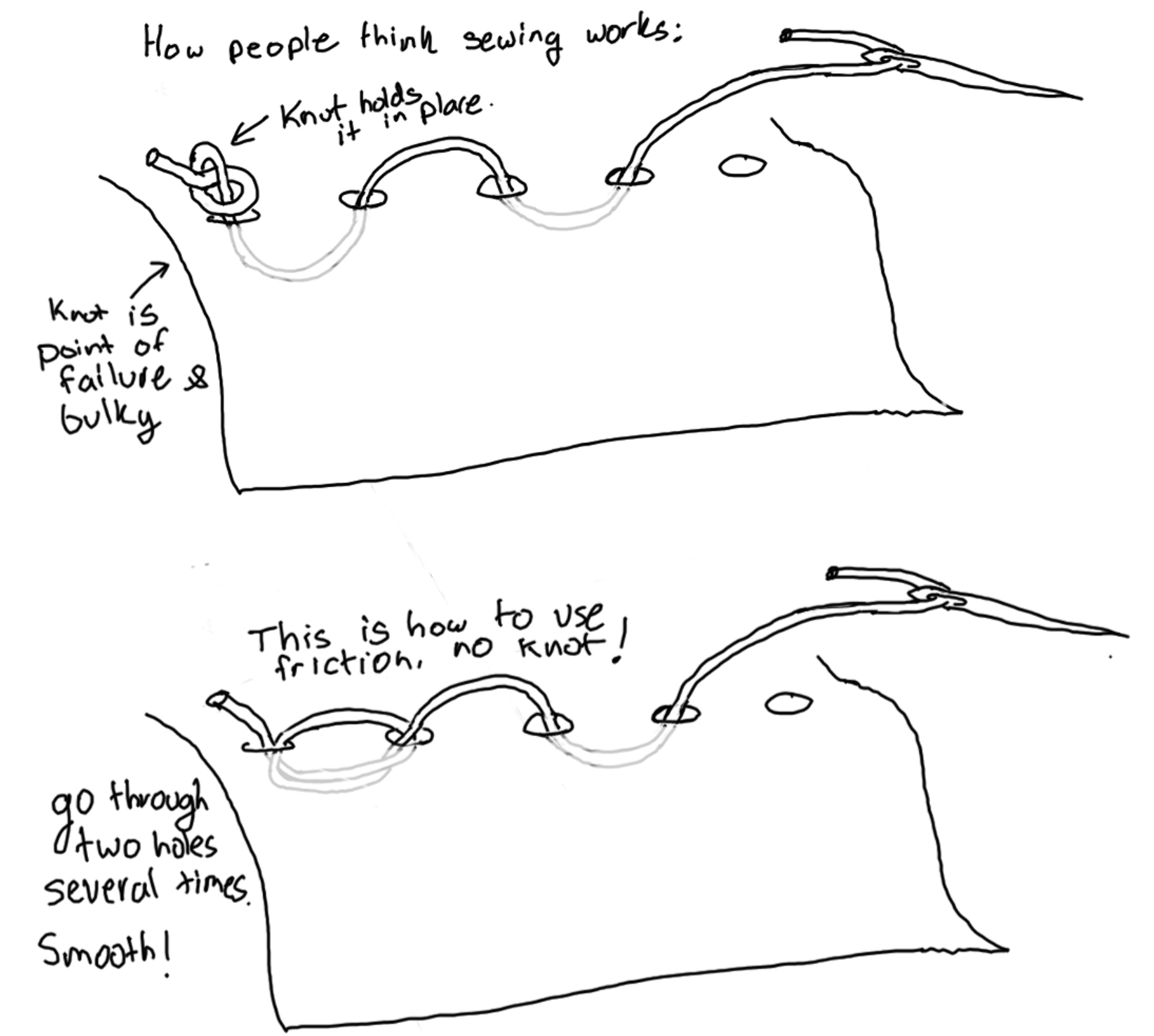Do not overthink the details of these diagrams. Consider the difference between using a knot to hold the thread vs. using friction.