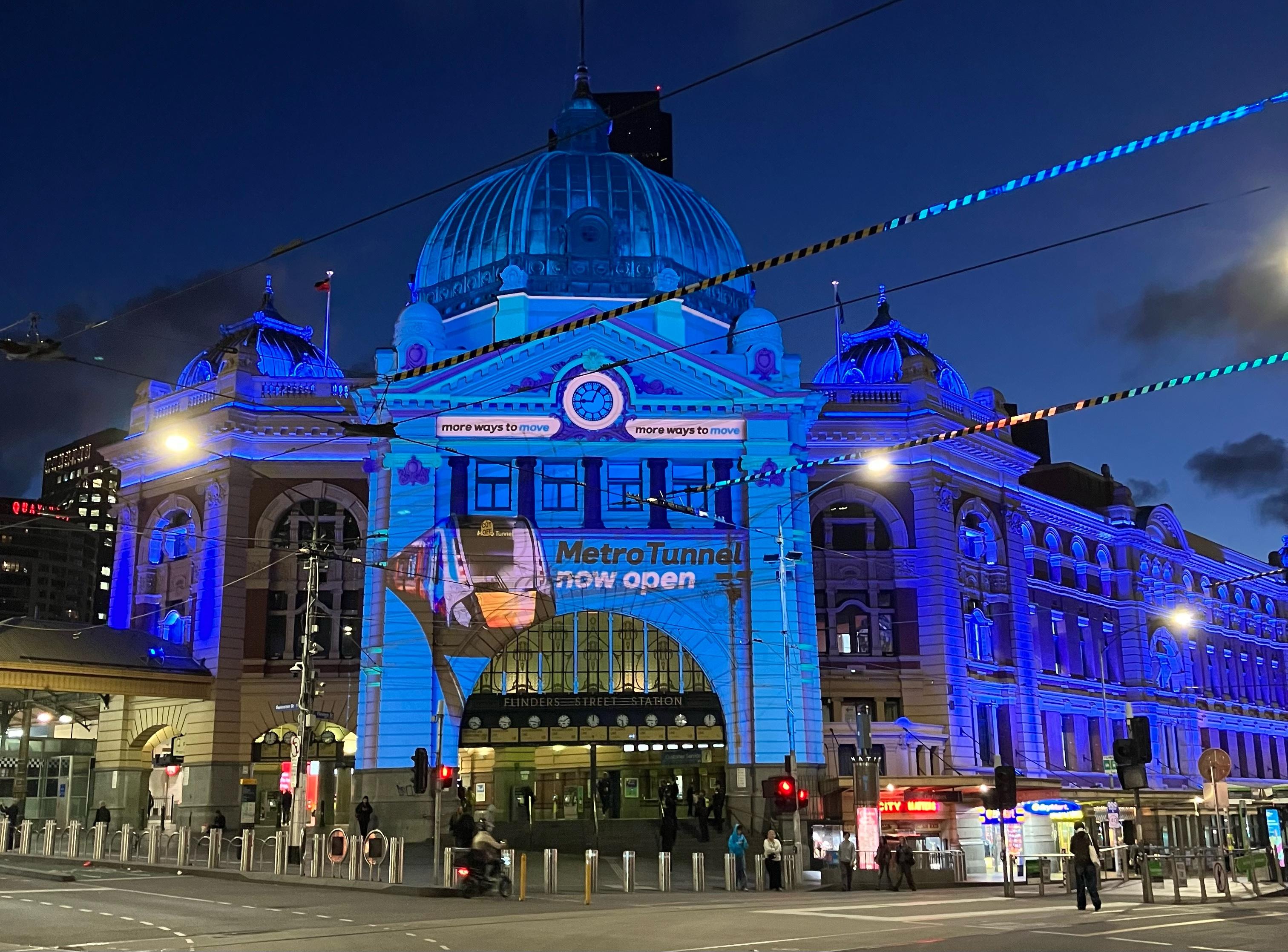 Flinders street station lit up in blue with projected graphics celebrating the opening of metro tunnel