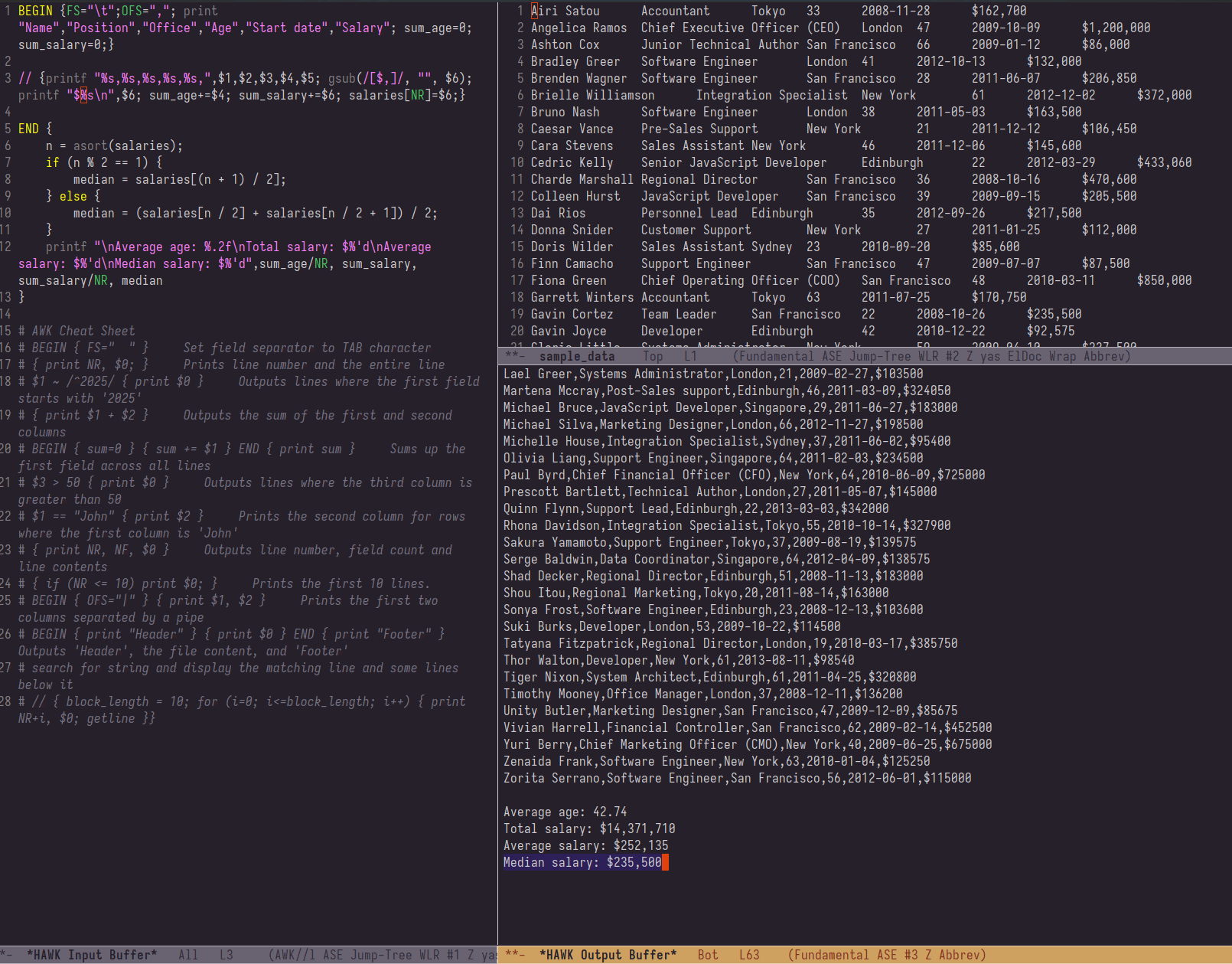 It uses the awk-mode to have syntax coloring and automatic indentation for your script, and evaluates your output with each keystroke (beware of side effects).
