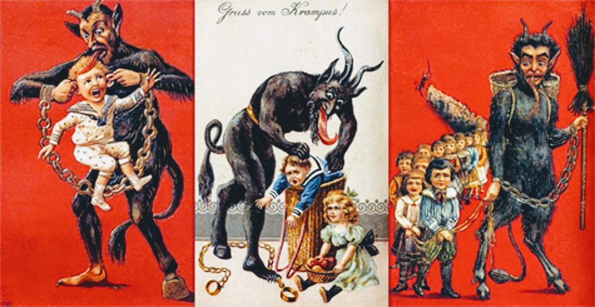 Careful out there tonight for it's #Krampusnacht! Popular in German-speaking Alpine folklore, the figure of #Krampus is a devil-like horned creature who punishes badly-behaved children the night before St Nicholas' Day. More Krampus cards here: https://publicdomainreview.org/collection/greetings-from-krampus