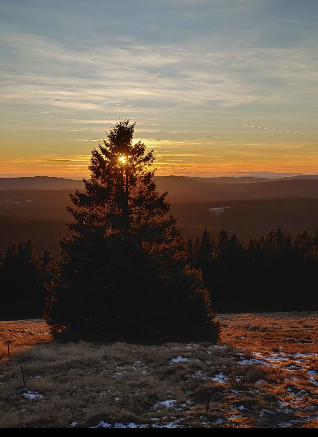 A single broad fir tree on a grassy clearing with some snowy patches. Spreading its branches, sun's setting behind them and the endless black silhouettes of snowless woodland.