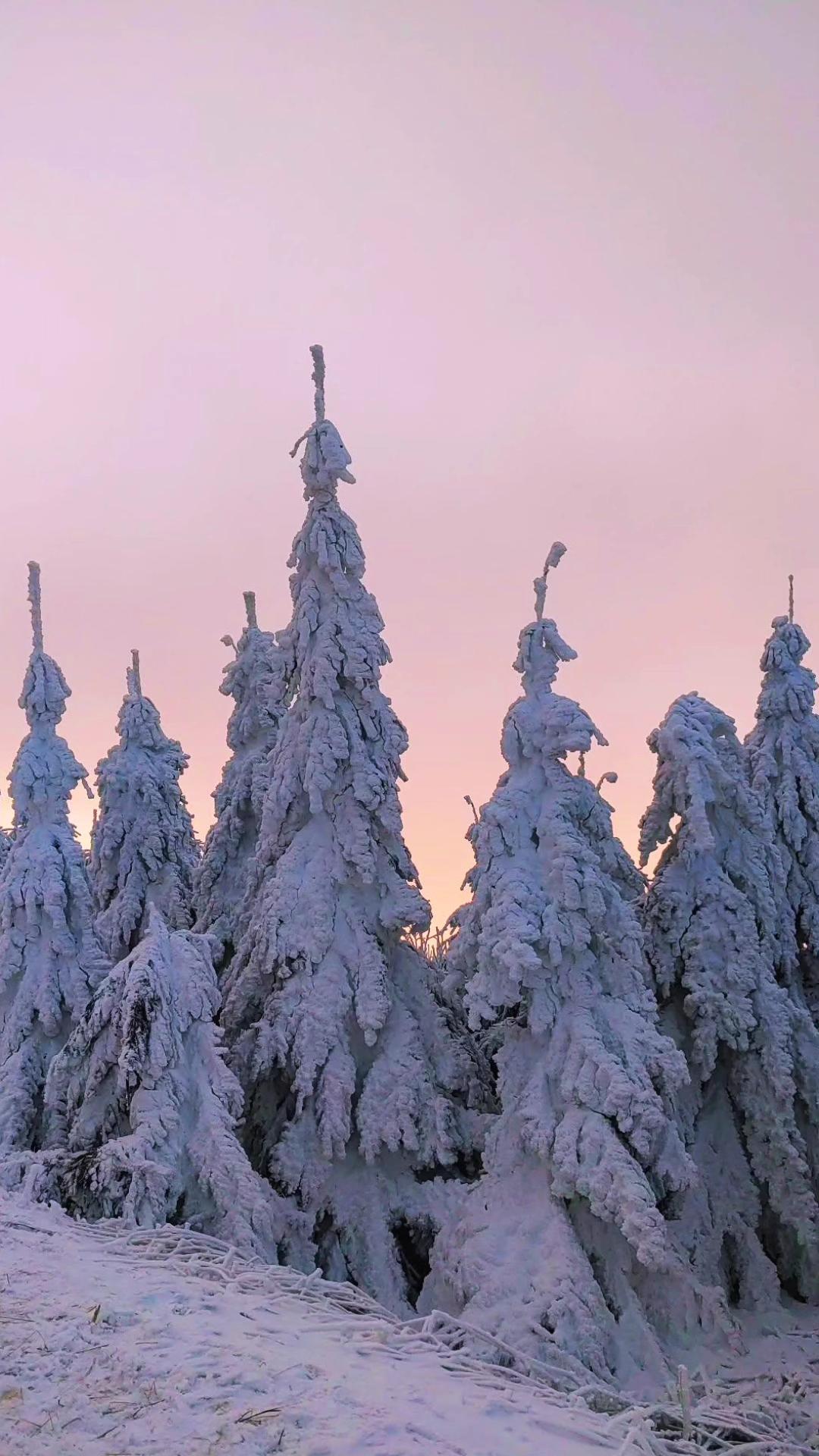 photo of tall fir trees, their branches pasted to their stems by snow and hoar frost. Seemingly Slimmed down and shrink-wrapped by cold wind