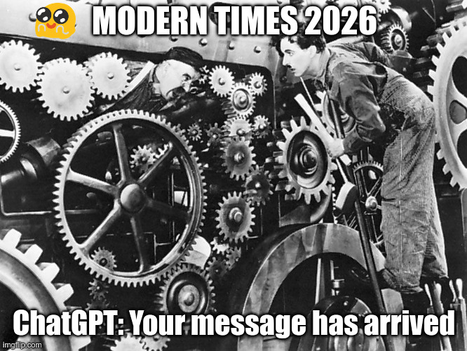 Meme with a scene from Charlie Chaplin's famous movie "Modern Times" showing a man stuck in the gears of a big machine, only their head sticking out, and a shocked and surprised Charlie Chaplin standing on a ladder and looking helpless. Top text says "Modern times 2026" preceded with a :blobaww: emoji, and the bottom text reads "ChatGPT: Your message has arrived".