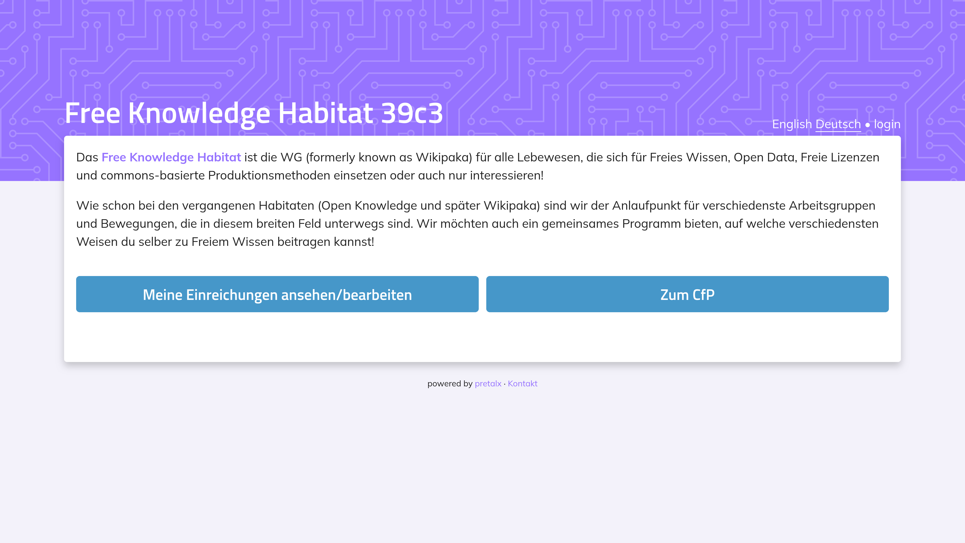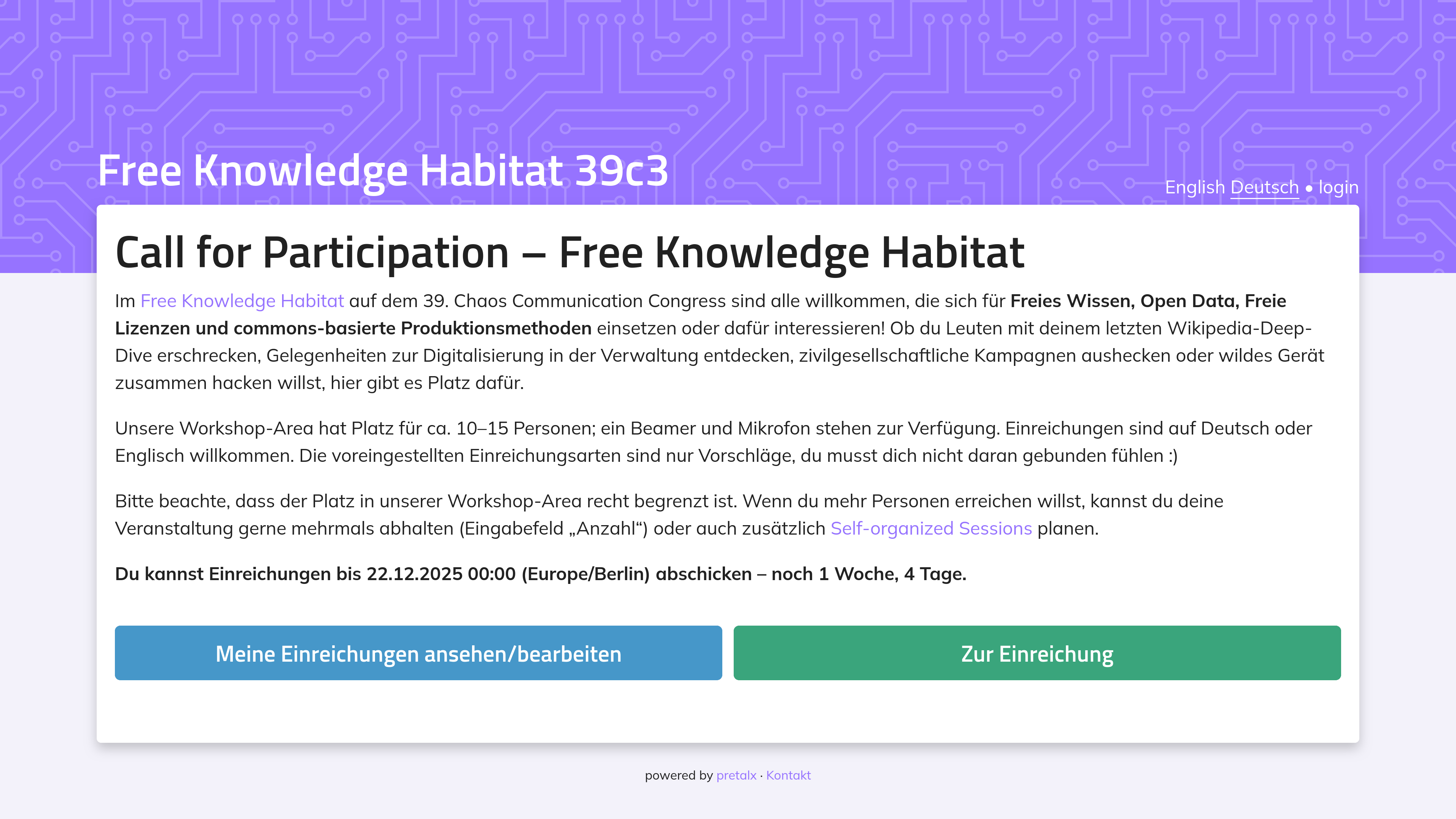 Im Free Knowledge Habitat auf dem 39. Chaos Communication Congress sind alle willkommen, die sich für Freies Wissen, Open Data, Freie Lizenzen und commons-basierte Produktionsmethoden einsetzen oder dafür interessieren! Ob du Leuten mit deinem letzten Wikipedia-Deep-Dive erschrecken, Gelegenheiten zur Digitalisierung in der Verwaltung entdecken, zivilgesellschaftliche Kampagnen aushecken oder wildes Gerät zusammen hacken willst, hier gibt es Platz dafür.