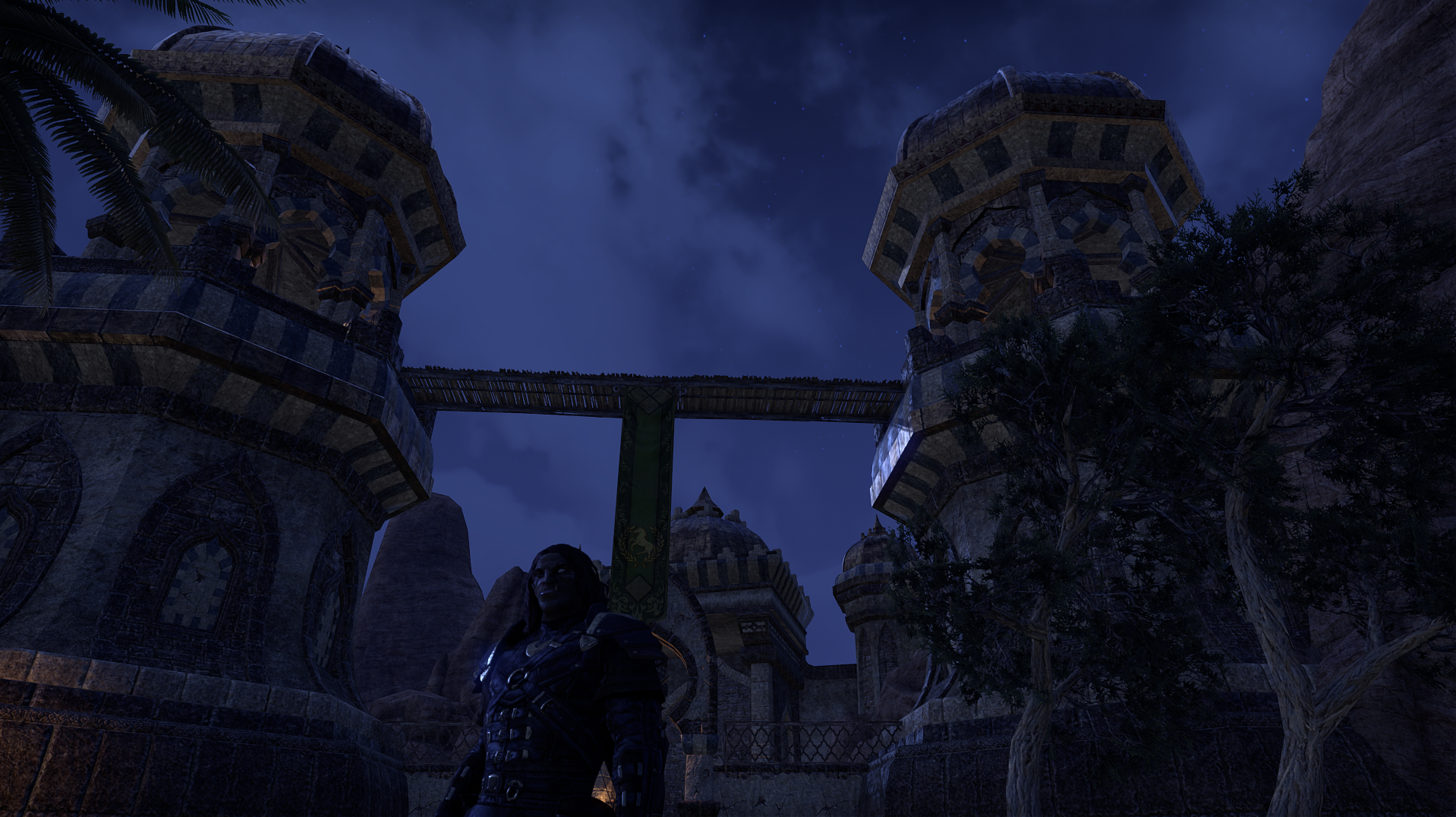 My Orc in ESO. In the background are the two towers found at his desert home in Al'Akir.